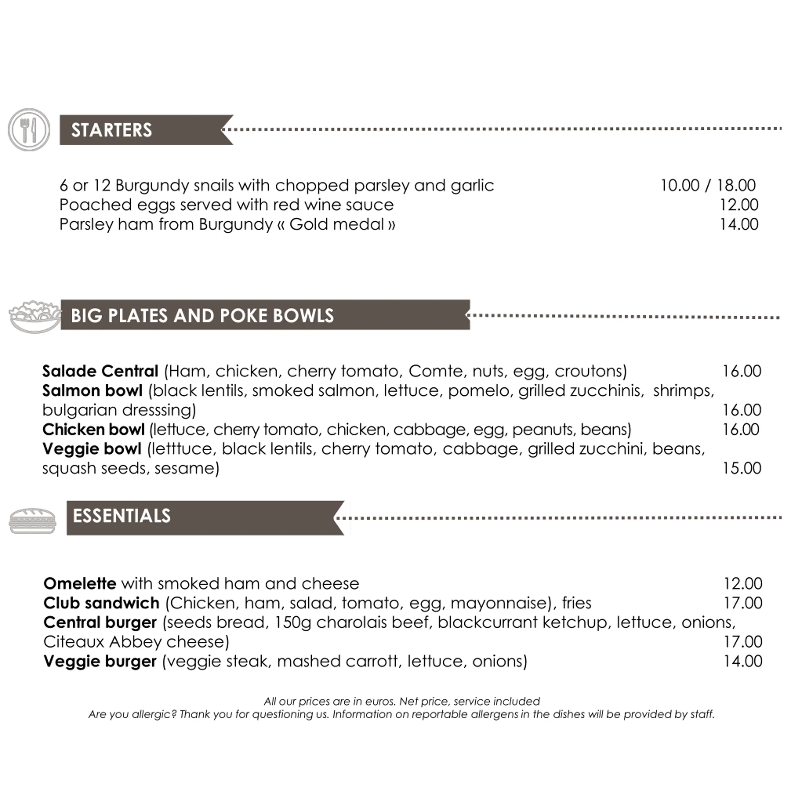STARTERS 6 or 12 Burgundy snails with chopped parsley and garlic Poached eggs served with red wine sauce Parsley ham from Burgundy Gold medal 10.00 / 18.00 12.00 14.00 BIG PLATES AND POKE BOWLS Salade Central (Ham, chicken, cherry tomato, Comte, nuts, egg, croutons) Salmon bowl (black lentils, smoked salmon, lettuce, pomelo, grilled zucchinis, shrimps, bulgarian dresssing) Chickenbowl (lettuce, cherry tomato, chicken, cabbage, egg, peanuts, beans) Veggie bowl (letttuce, black lentils, cherry tomato, cabbage, grilled zucchini, beans, squash seeds, sesame) 16.00 16.00 16.00 15.00 ESSENTIALS Omelette with smoked ham and cheese Club sandwich (Chicken, ham, salad, tomato, egg, mayonnaise), fries Central burger (seeds bread, 150g charolais beef, blackcurrant ketchup, lettuce, onions, Citeaux Abbey cheese) Veggie burger (veggie steak, mashed carrott, lettuce, onions) 12.00 17.00 17.00 14.00 All our prices are in euros. Net price, service included Are you allergic? Thank you for questioning us. Information on reportable allergens in the dishes will be provided by staff.