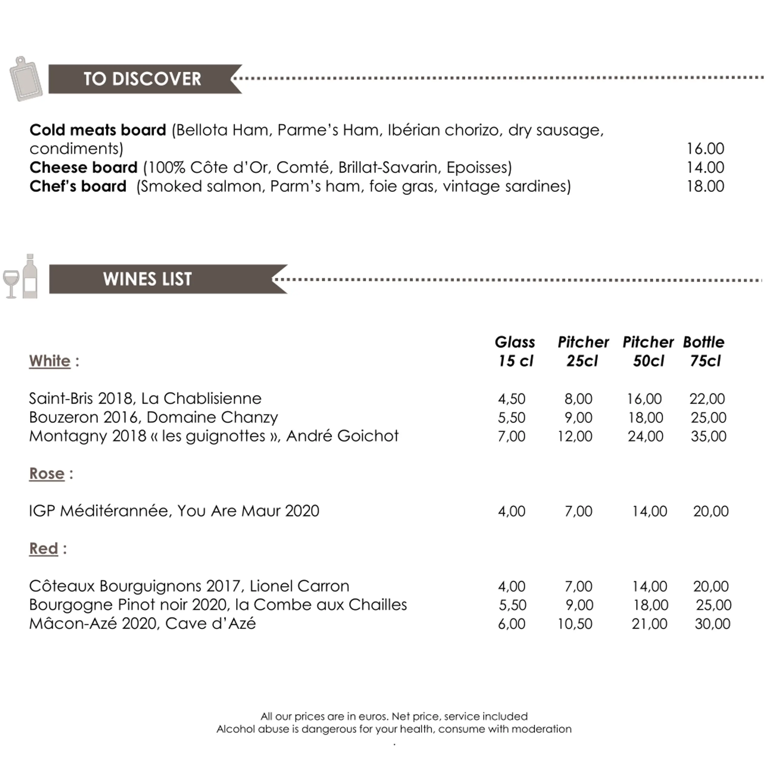 TO DISCOVER Cold meats board (Bellota Ham, Parme s Ham, Ib rian chorizo, dry sausage, condiments) Cheese board (100% C te d Or, Comt , Brillat-Savarin, Epoisses) Chef s board (Smoked salmon, Parm s ham, foie gras, vintage sardines) 16.00 14.00 18.00 WINES LIST Glass 15 cl Pitcher Pitcher Bottle 25cl 50cl White : 75cl Saint-Bris 2018, La Chablisienne Bouzeron 2016, Domaine Chanzy Montagny 2018 les guignottes , Andr Goichot 4,50 8,00 5,50 9,00 18,00 25,00 7,00 12,00 24,00 35,00 16,00 22,00 Rose : IGP M dit rann e, You Are Maur 2020 4,00 7,00 14,00 20,00 Red : C teaux Bourguignons 2017, Lionel Carron Bourgogne Pinot noir 2020, la Combe aux Chailles 5,50 9,00 18,00 25,00 M con-Az 2020, Cave d Az 4,00 7,00 14,00 20,00 6,00 10,50 21,00 30,00 All our prices are in euros. Net price, service included Alcohol abuse is dangerous for your health, consume with moderation .