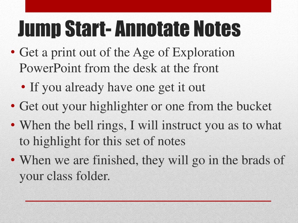 Jump Start-Annotate Notes Get a print out of the Age of Exploration PowerPoint from the desk at the front If you already have one get it out Get out your highlighter or one from the bucket When the bell rings, I will instruct you as to what to highlight for this set of notes When we are finished, they will go in the brads of your class folder.