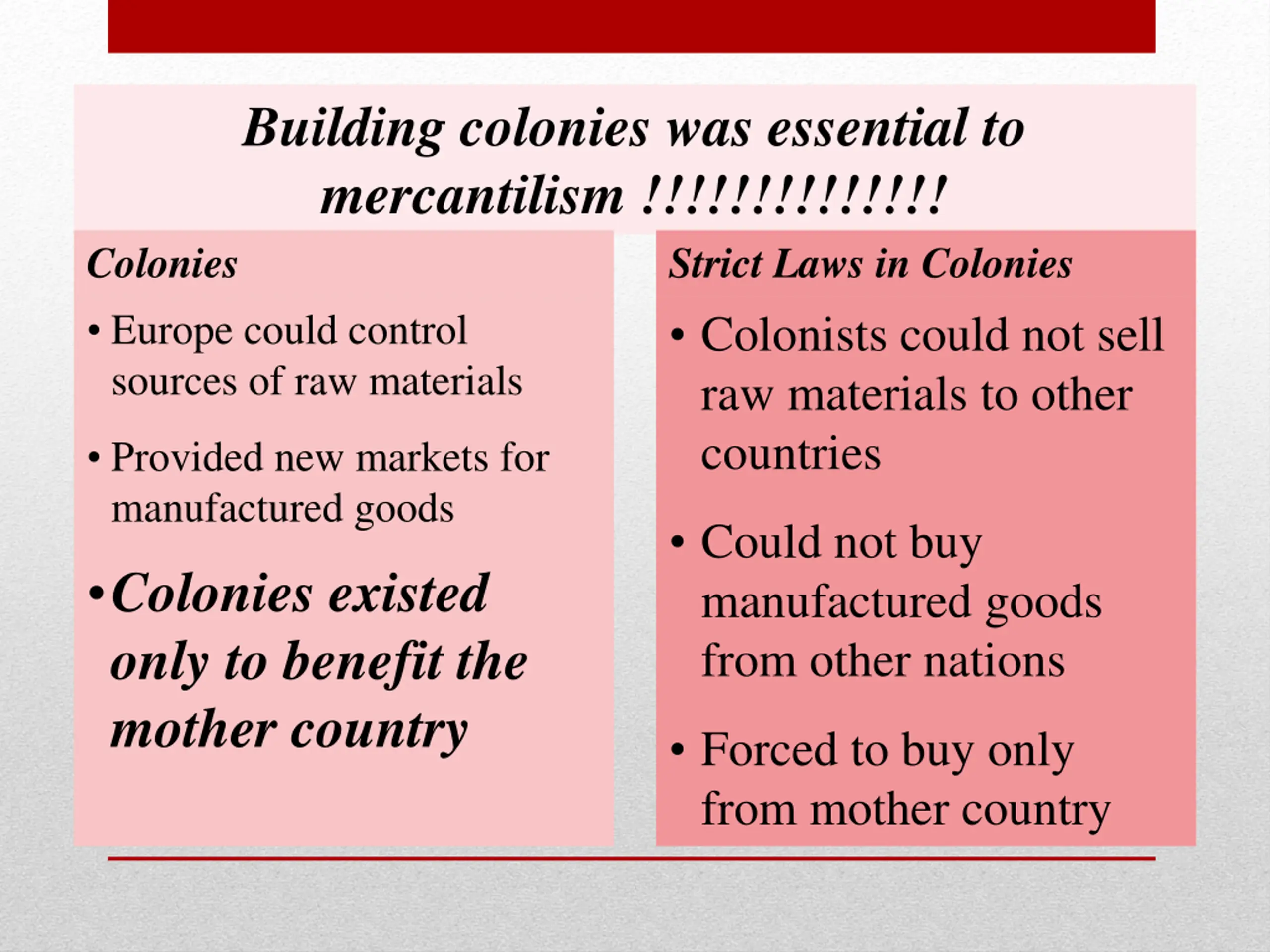 Building colonies was essential to mercantilism !!!!!!!!!!!!!! Colonies Strict Laws in Colonies Europe could control sources of raw materials Colonists could not sell raw materials to other countries Provided new markets for manufactured goods Colonies existed only to benefit the mother country Could not buy manufactured goods from other nations Forced to buy only from mother country