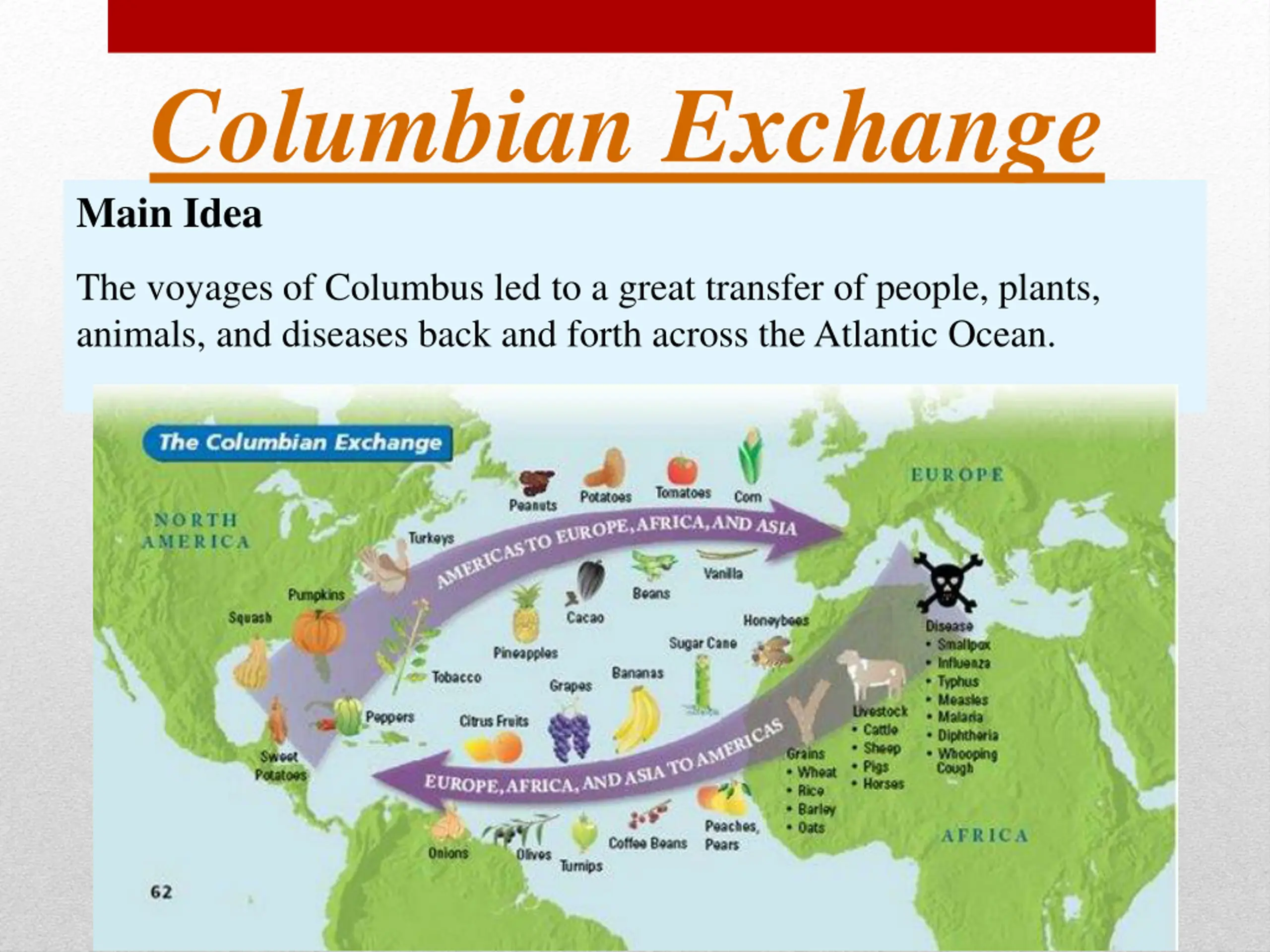 Columbian Exchange Main Idea The voyages of Columbus led to a great transfer of people, plants, animals, and diseases back and forth across the Atlantic Ocean.