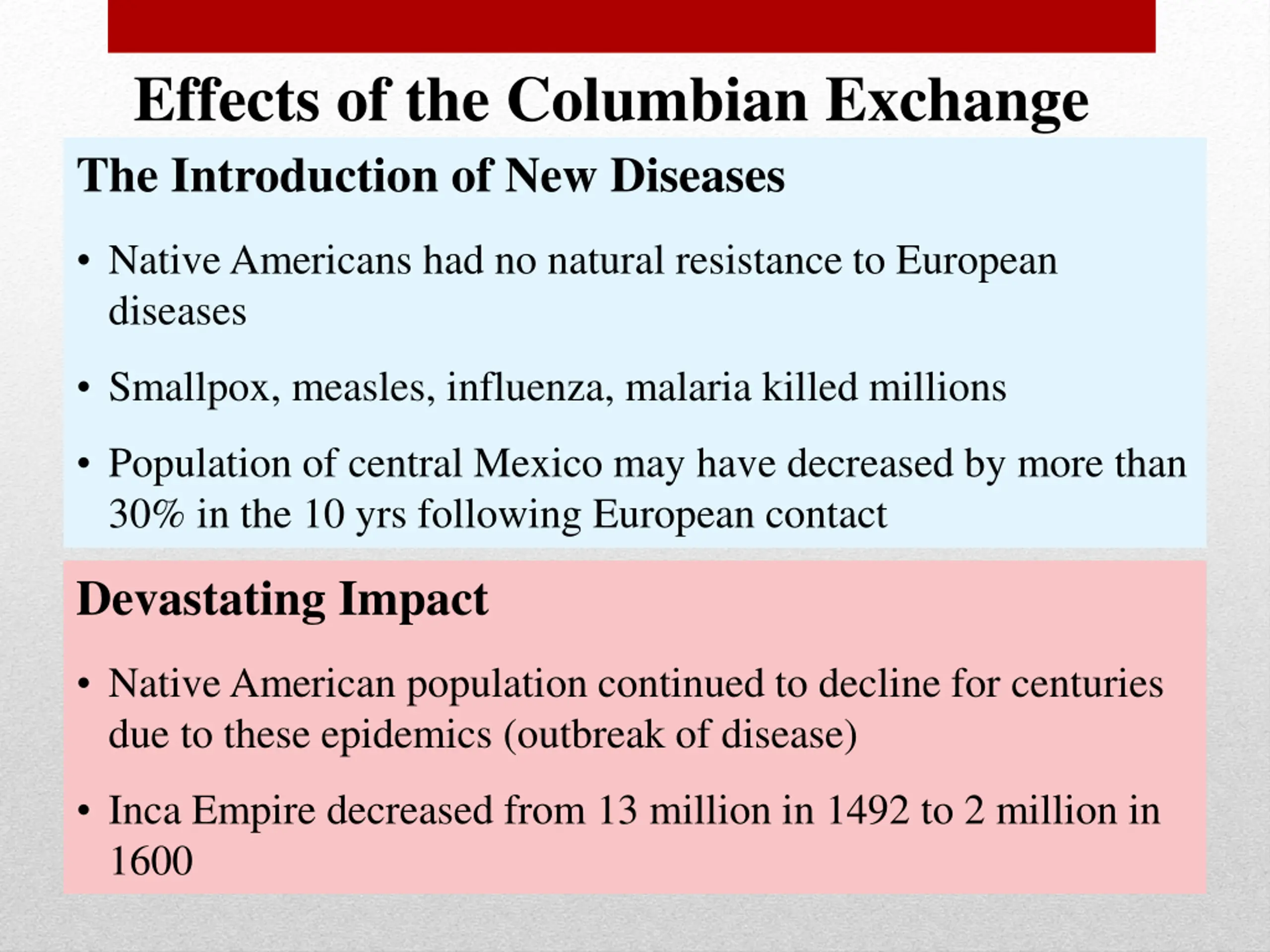Effects of the Columbian Exchange The Introduction of New Diseases Native Americans had no natural resistance to European diseases Smallpox, measles, influenza, malaria killed millions Population of central Mexico may have decreased by more than 30% in the 10 yrs following European contact Devastating Impact Native American population continued to decline for centuries due to these epidemics (outbreak of disease) Inca Empire decreased from 13 million in 1492 to 2 million in 1600