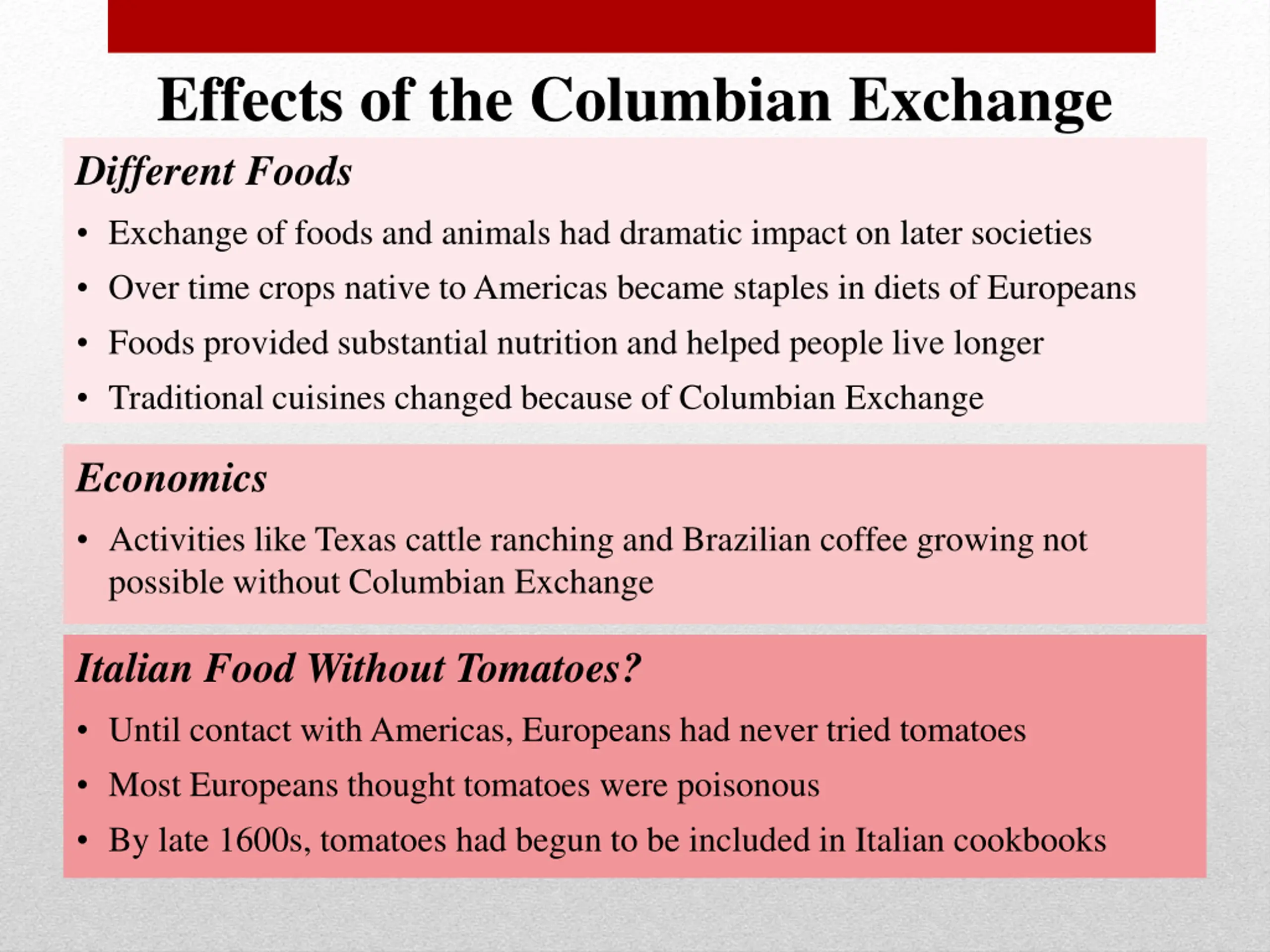 Effects of the Columbian Exchange Different Foods Exchange of foods and animals had dramatic impact on later societies Over time crops native to Americas became staples in diets of Europeans Foods provided substantial nutrition and helped people live longer Traditional cuisines changed because of Columbian Exchange Economics Activities like Texas cattle ranching and Brazilian coffee growing not possible without Columbian Exchange Italian Food Without Tomatoes? Until contact with Americas, Europeans had never tried tomatoes Most Europeans thought tomatoes were poisonous By late 1600s, tomatoes had begun to be included in Italian cookbooks