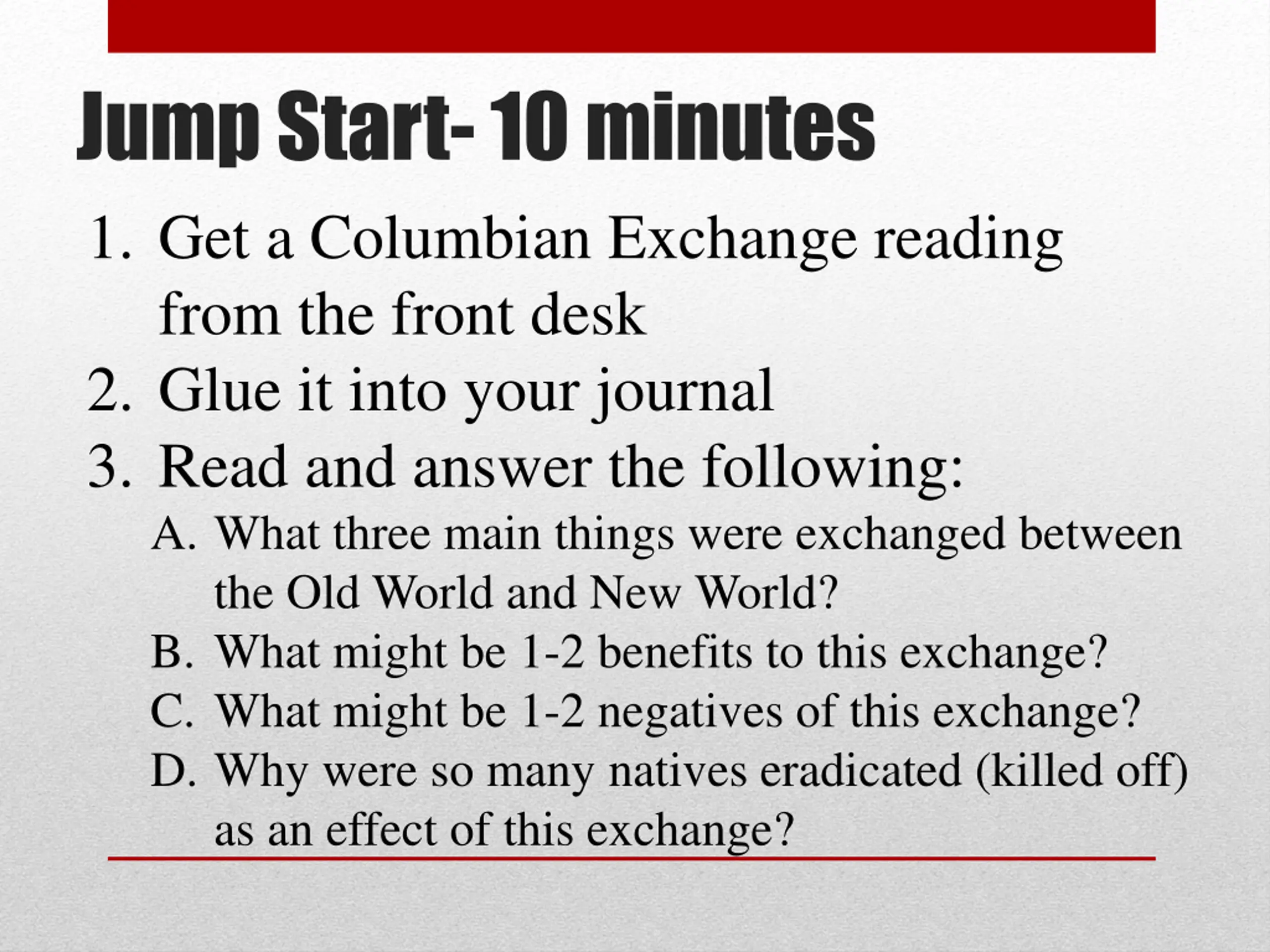Jump Start- 10 minutes 1. Get a Columbian Exchange reading from the front desk 2. Glue it into your journal 3. Read and answer the following: A. What three main things were exchanged between the Old World and New World? B. What might be 1-2 benefits to this exchange? C. What might be 1-2 negatives of this exchange? D. Why were so many natives eradicated (killed off) as an effect of this exchange?
