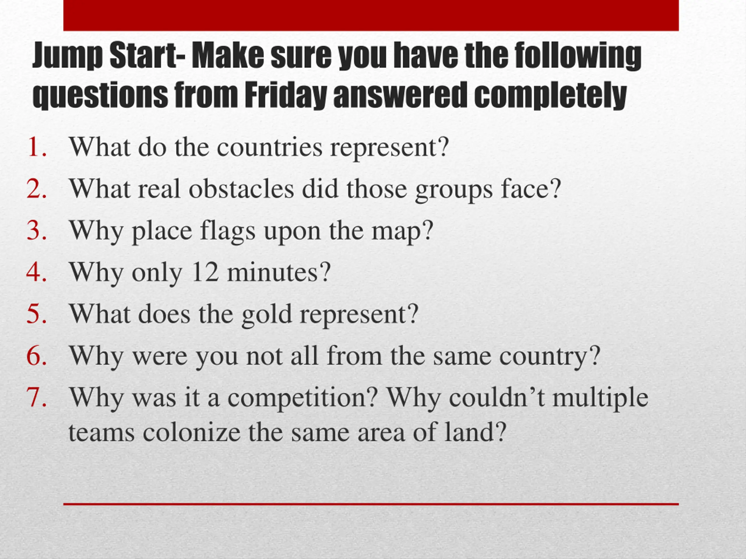 Jump Start-Make sure you have the following questions from Friday answered completely 1. What do the countries represent? 2. What real obstacles did those groups face? 3. Why place flags upon the map? 4. Why only 12 minutes? 5. What does the gold represent? 6. Why were you not all from the same country? 7. Why was it a competition? Why couldn t multiple teams colonize the same area of land?