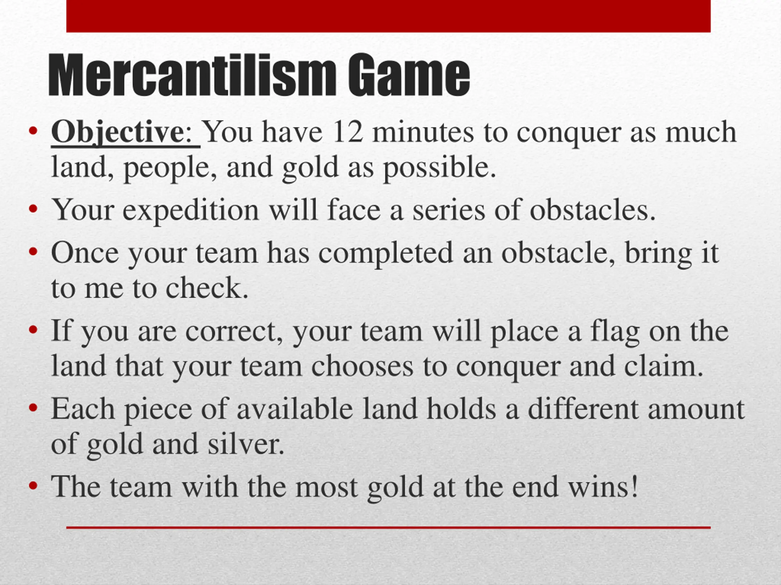 Mercantilism Game Objective: You have 12 minutes to conquer as much land, people, and gold as possible. Your expedition will face a series of obstacles. Once your team has completed an obstacle, bring it to me to check. If you are correct, your team will place a flag on the land that your team chooses to conquer and claim. Each piece of available land holds a different amount of gold and silver. The team with the most gold at the end wins!