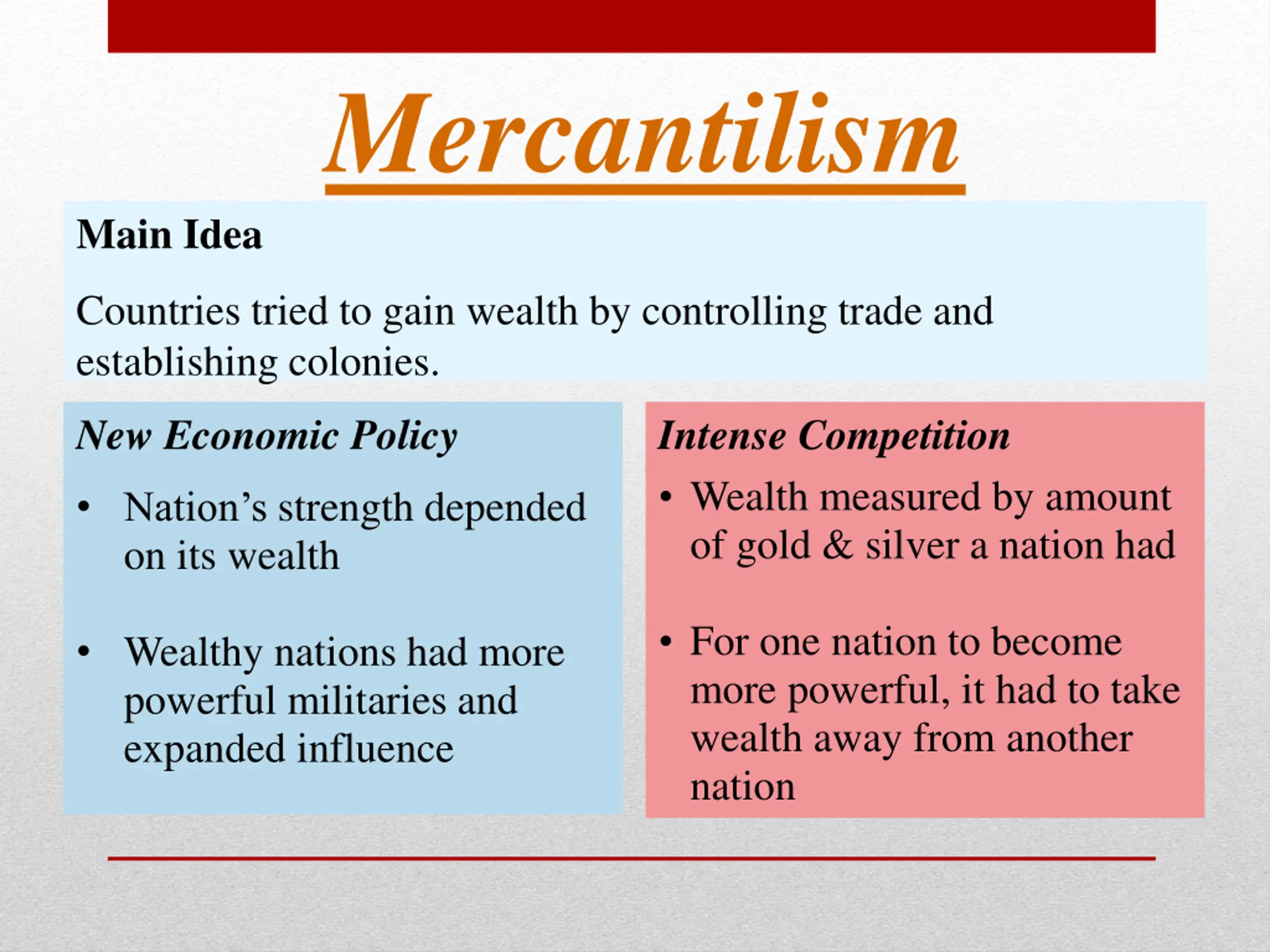 Mercantilism Main Idea Countries tried to gain wealth by controlling trade and establishing colonies. New Economic Policy Intense Competition Wealth measured by amount of gold & silver a nation had Nation s strength depended on its wealth For one nation to become more powerful, it had to take wealth away from another nation Wealthy nations had more powerful militaries and expanded influence