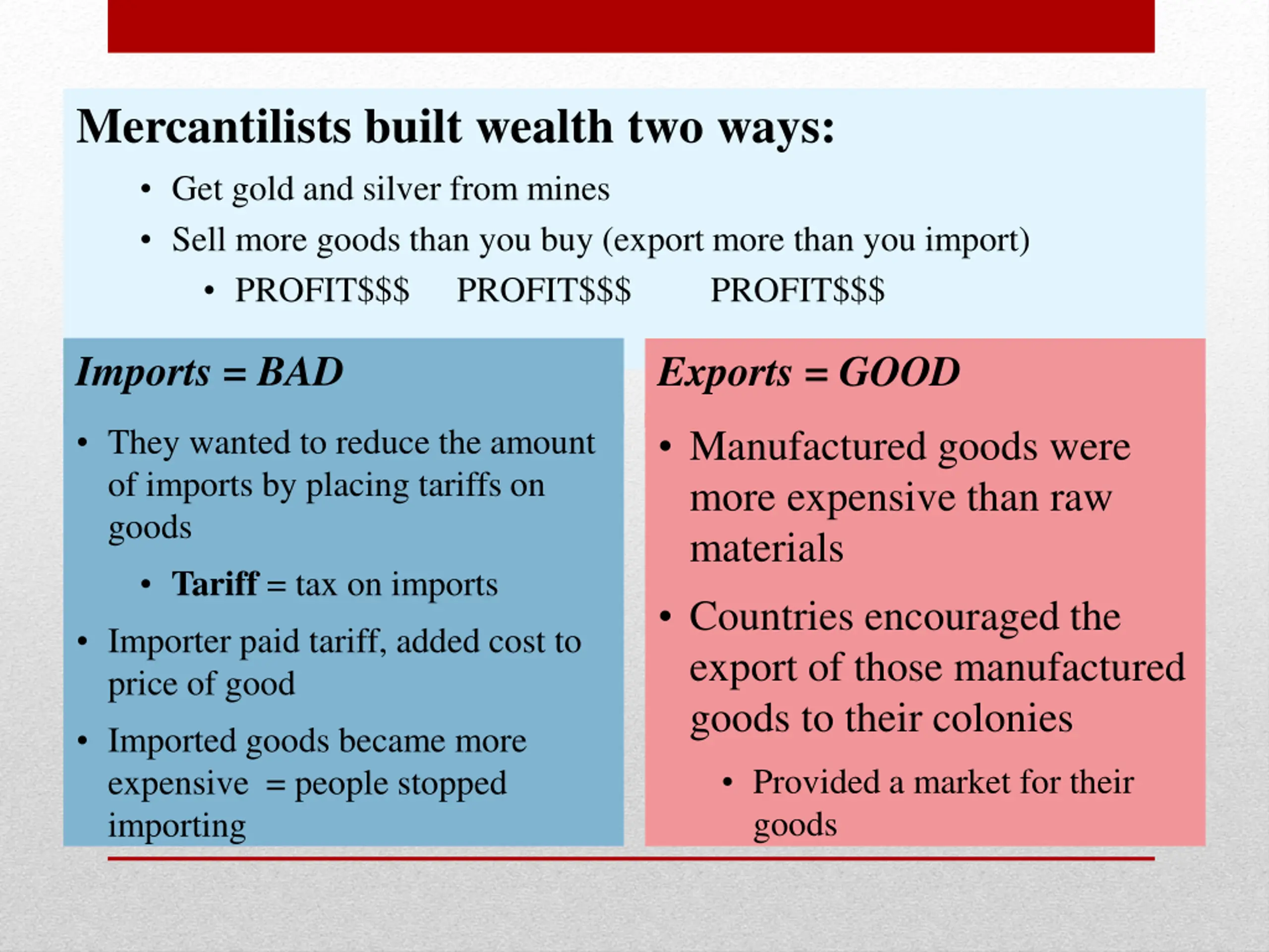 Mercantilists built wealth two ways: Get gold and silver from mines Sell more goods than you buy (export more than you import) PROFIT$$$ PROFIT$$$ PROFIT$$$ Imports = BAD Exports = GOOD Manufactured goods were more expensive than raw materials Countries encouraged the export of those manufactured goods to their colonies They wanted to reduce the amount of imports by placing tariffs on goods Tariff = tax on imports Importer paid tariff, added cost to price of good Imported goods became more expensive = people stopped importing Provided a market for their goods