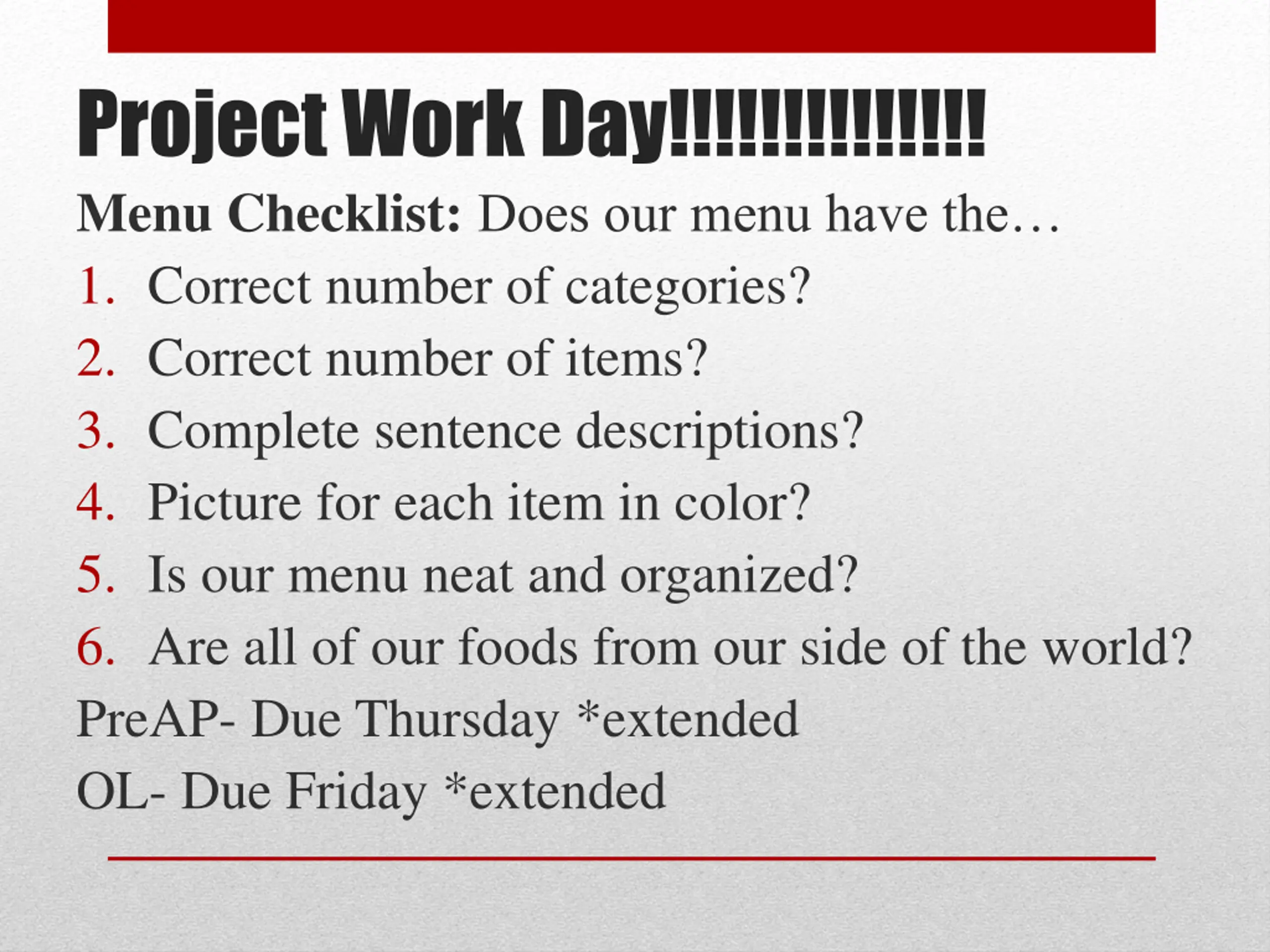 Project Work Day!!!!!!!!!!!!!! Menu Checklist: Does our menu have the 1. Correct number of categories? 2. Correct number of items? 3. Complete sentence descriptions? 4. Picture for each item in color? 5. Is our menu neat and organized? 6. Are all of our foods from our side of the world? PreAP- Due Thursday *extended OL- Due Friday *extended