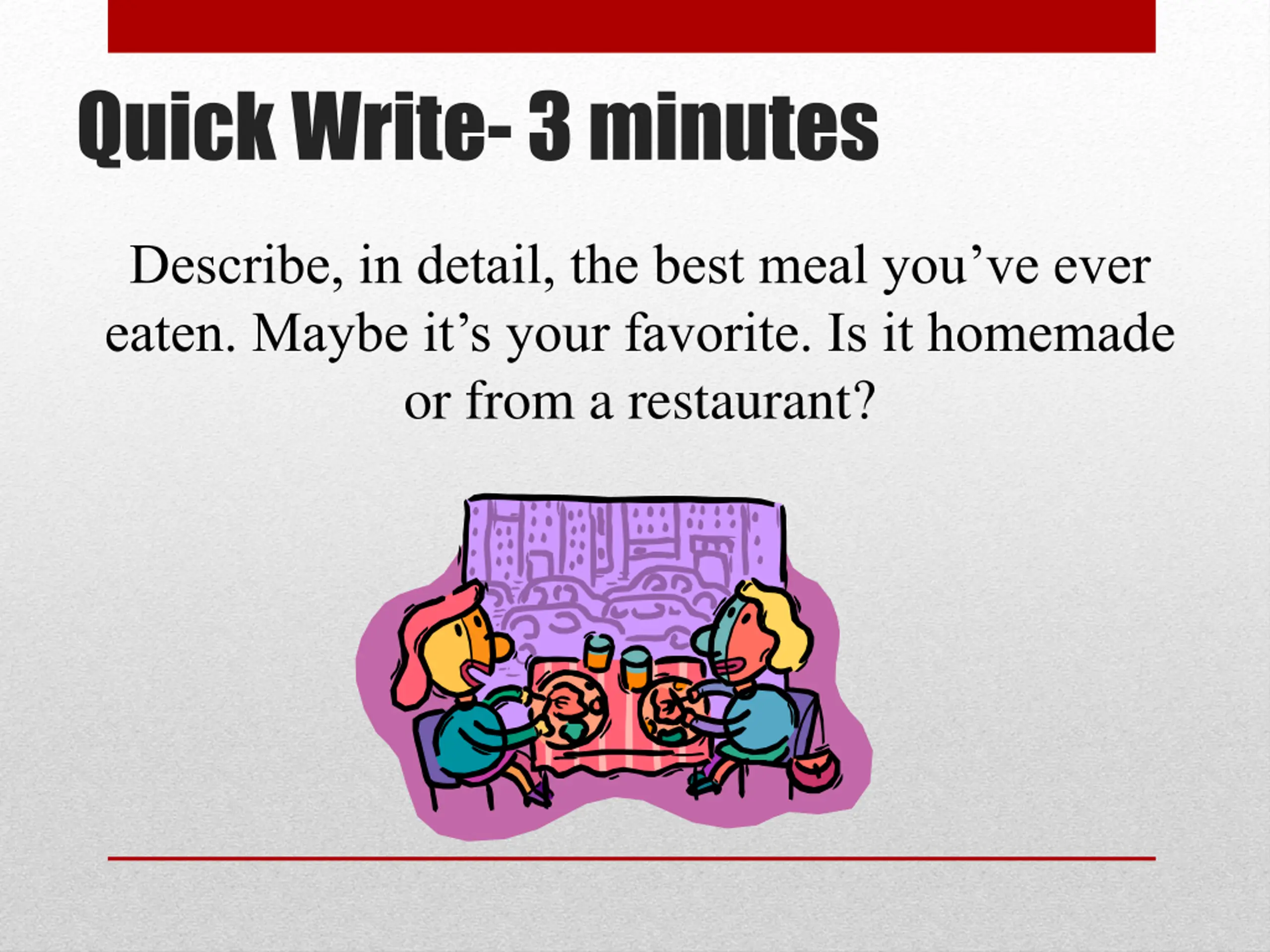 Quick Write- 3 minutes Describe, in detail, the best meal you ve ever eaten. Maybe it s your favorite. Is it homemade or from a restaurant?