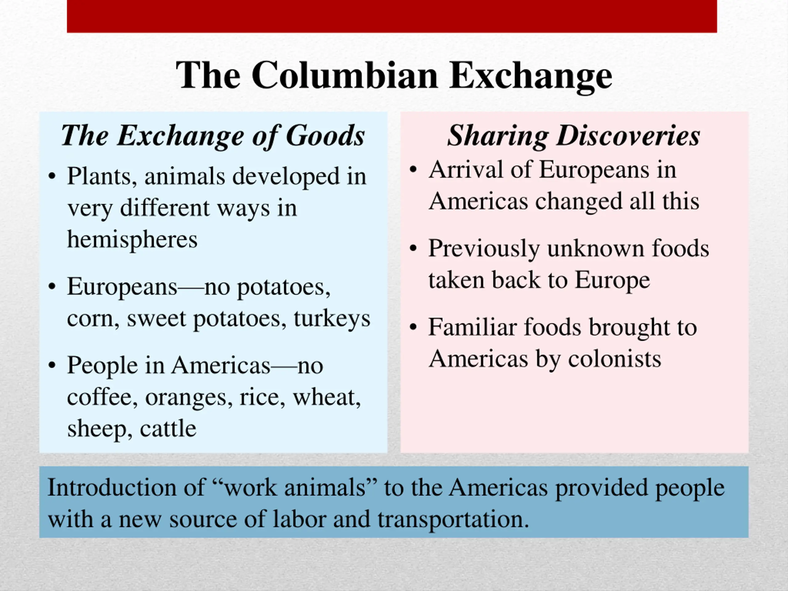 The Columbian Exchange The Exchange of Goods Sharing Discoveries Arrival of Europeans in Americas changed all this Plants, animals developed in very different ways in hemispheres Previously unknown foods taken back to Europe Europeans no potatoes, corn, sweet potatoes, turkeys Familiar foods brought to Americas by colonists People in Americas no coffee, oranges, rice, wheat, sheep, cattle Introduction of work animals to the Americas provided people with a new source of labor and transportation.