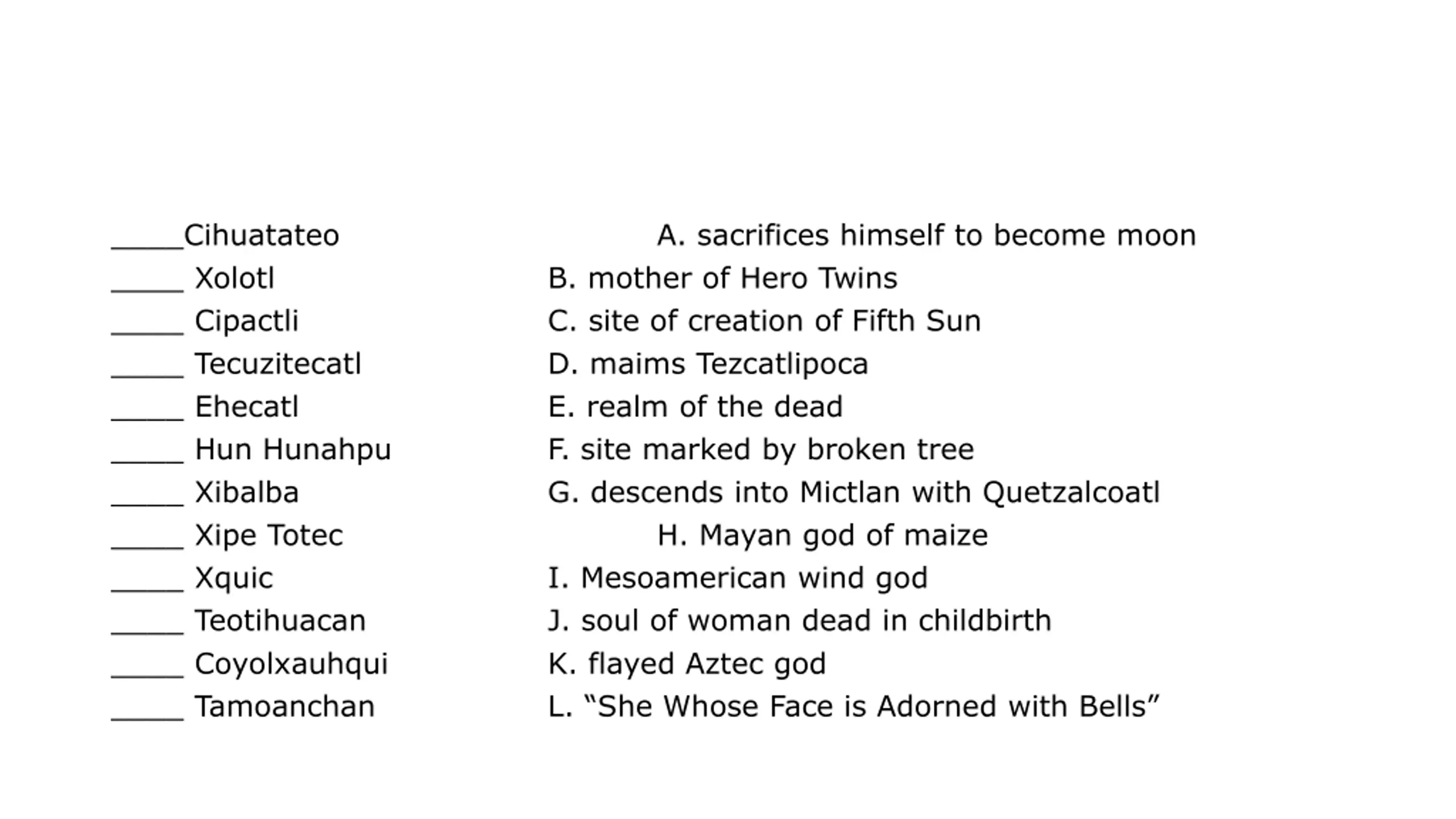 ____Cihuatateo ____ Xolotl ____ Cipactli ____ Tecuzitecatl ____ Ehecatl ____ Hun Hunahpu ____ Xibalba ____ Xipe Totec ____ Xquic ____ Teotihuacan ____ Coyolxauhqui ____ Tamoanchan A. sacrifices himself to become moon B. mother of Hero Twins C. site of creation of Fifth Sun D. maims Tezcatlipoca E. realm of the dead F. site marked by broken tree G. descends into Mictlan with Quetzalcoatl H. Mayan god of maize I. Mesoamerican wind god J. soul of woman dead in childbirth K. flayed Aztec god L. She Whose Face is Adorned with Bells