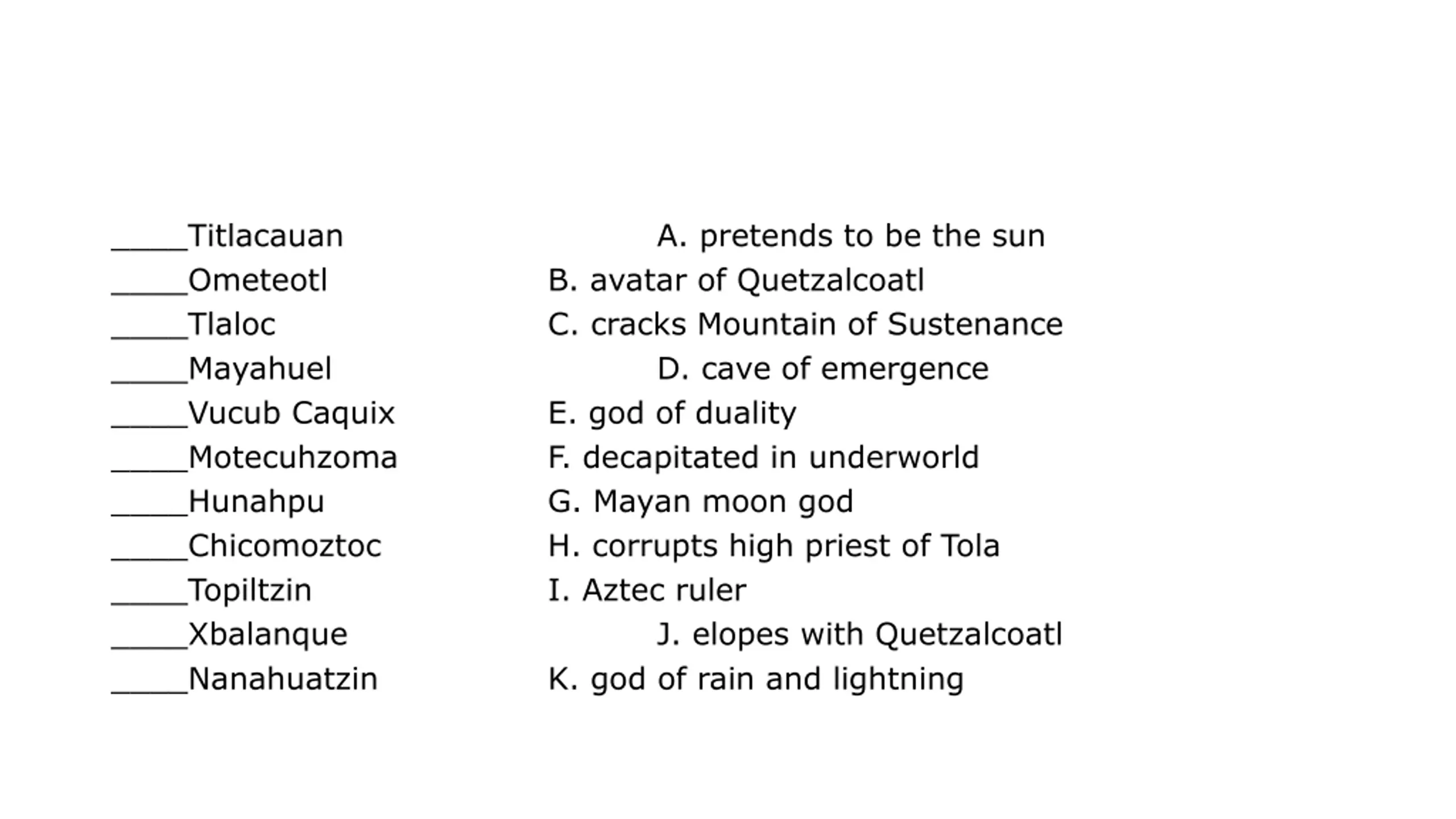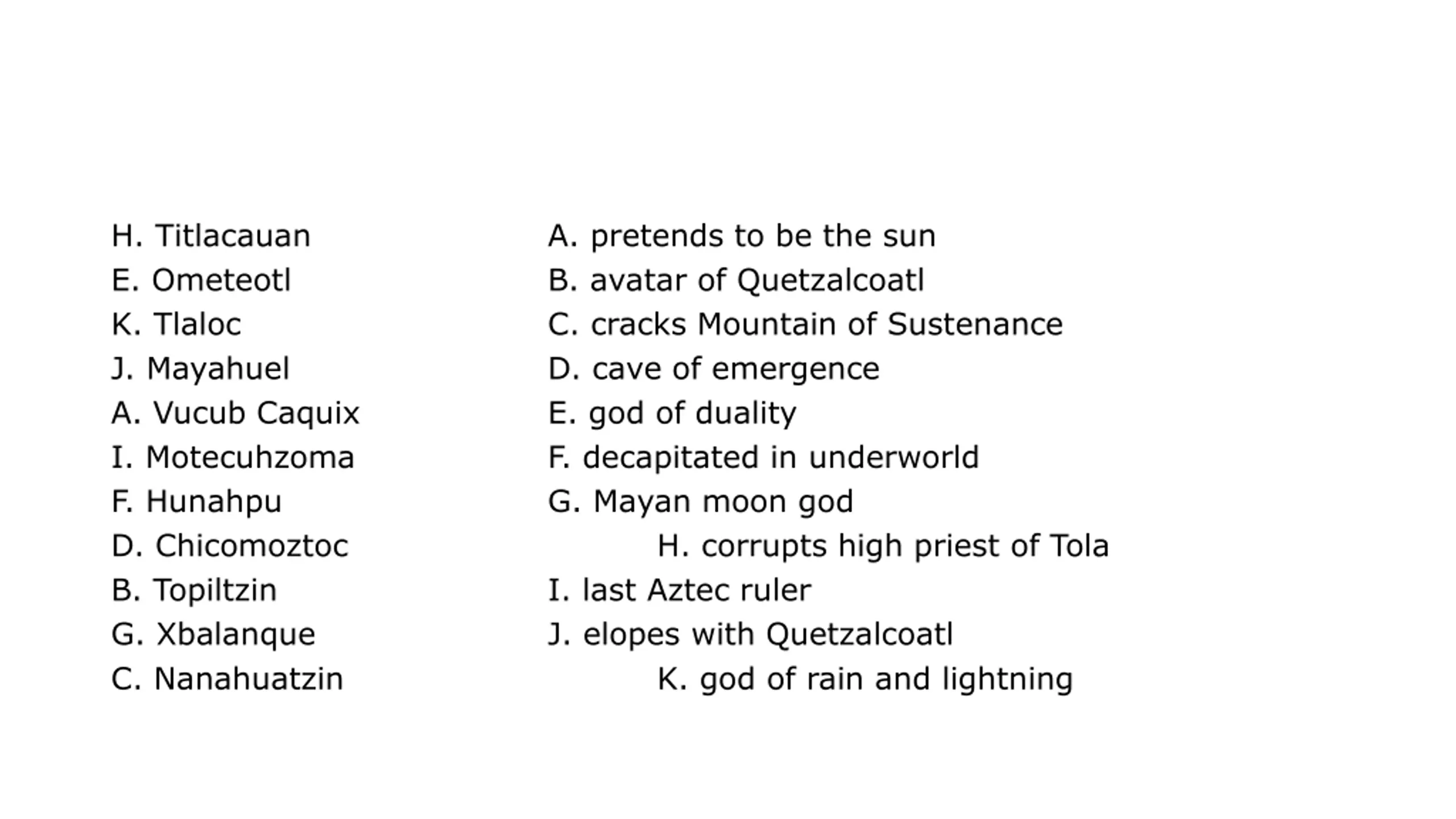 ____Titlacauan ____Ometeotl ____Tlaloc ____Mayahuel ____Vucub Caquix ____Motecuhzoma ____Hunahpu ____Chicomoztoc ____Topiltzin ____Xbalanque ____Nanahuatzin A. pretends to be the sun B. avatar of Quetzalcoatl C. cracks Mountain of Sustenance D. cave of emergence E. god of duality F. decapitated in underworld G. Mayan moon god H. corrupts high priest of Tola I. Aztec ruler J. elopes with Quetzalcoatl K. god of rain and lightning