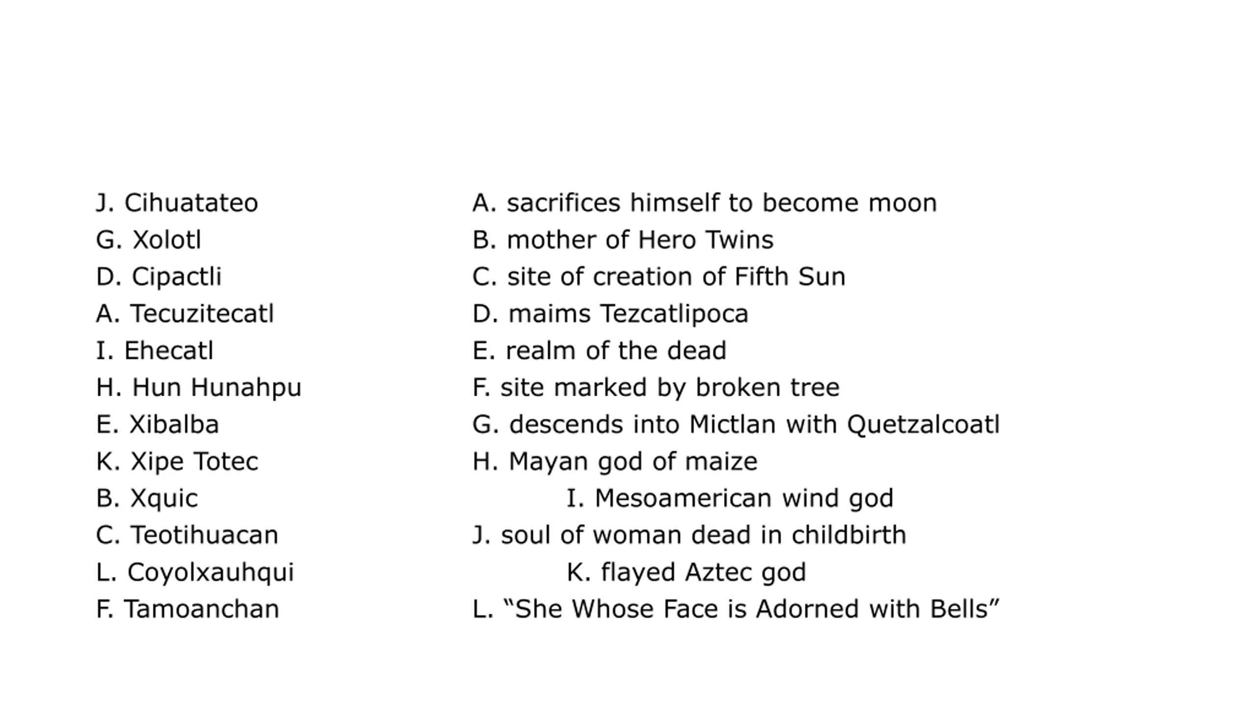 J. Cihuatateo G. Xolotl D. Cipactli A. Tecuzitecatl I. Ehecatl H. Hun Hunahpu E. Xibalba K. Xipe Totec B. Xquic C. Teotihuacan L. Coyolxauhqui F. Tamoanchan A. sacrifices himself to become moon B. mother of Hero Twins C. site of creation of Fifth Sun D. maims Tezcatlipoca E. realm of the dead F. site marked by broken tree G. descends into Mictlan with Quetzalcoatl H. Mayan god of maize I. Mesoamerican wind god J. soul of woman dead in childbirth K. flayed Aztec god L. She Whose Face is Adorned with Bells