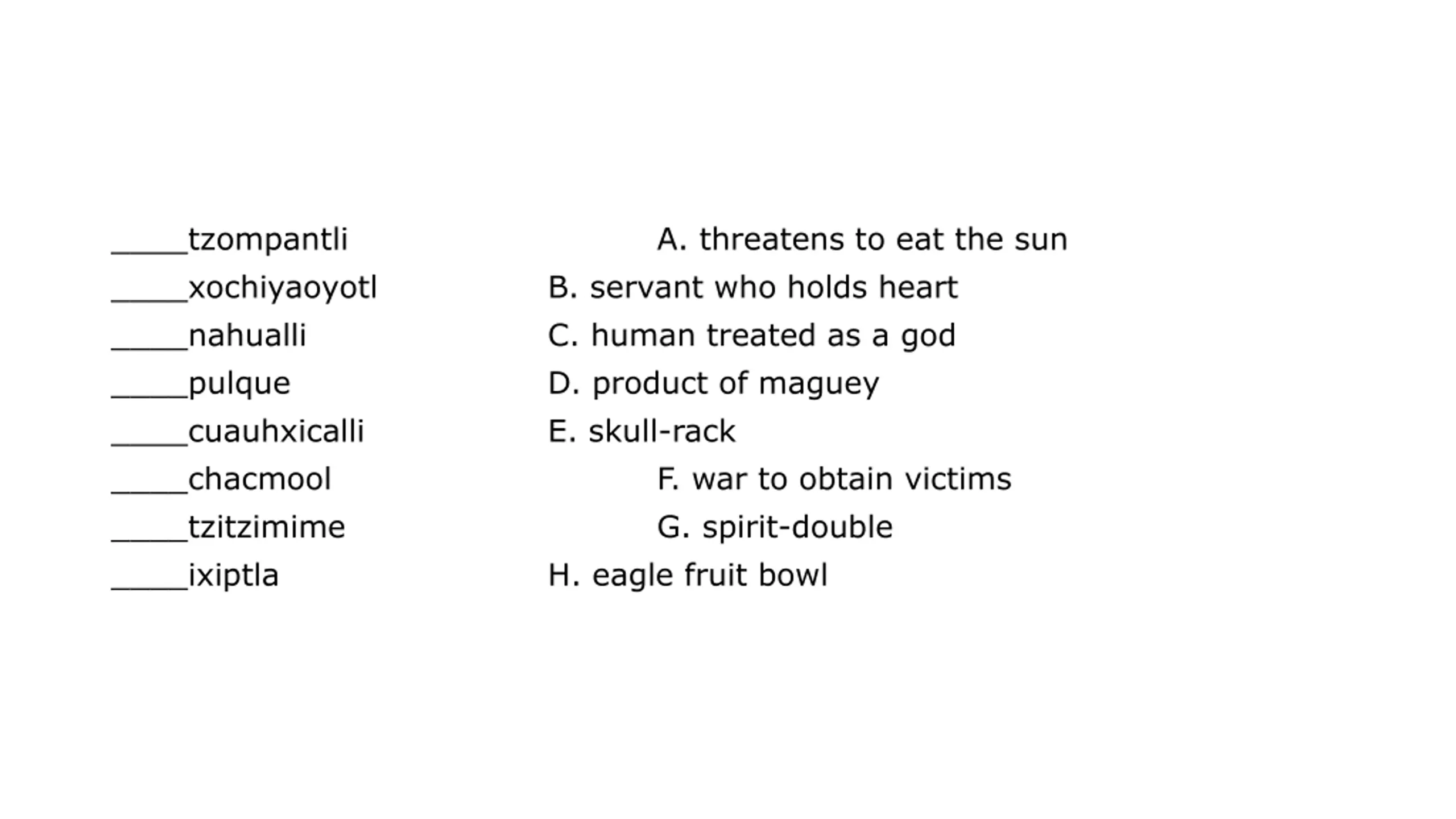 ____tzompantli ____xochiyaoyotl ____nahualli ____pulque ____cuauhxicalli ____chacmool ____tzitzimime ____ixiptla A. threatens to eat the sun B. servant who holds heart C. human treated as a god D. product of maguey E. skull-rack F. war to obtain victims G. spirit-double H. eagle fruit bowl