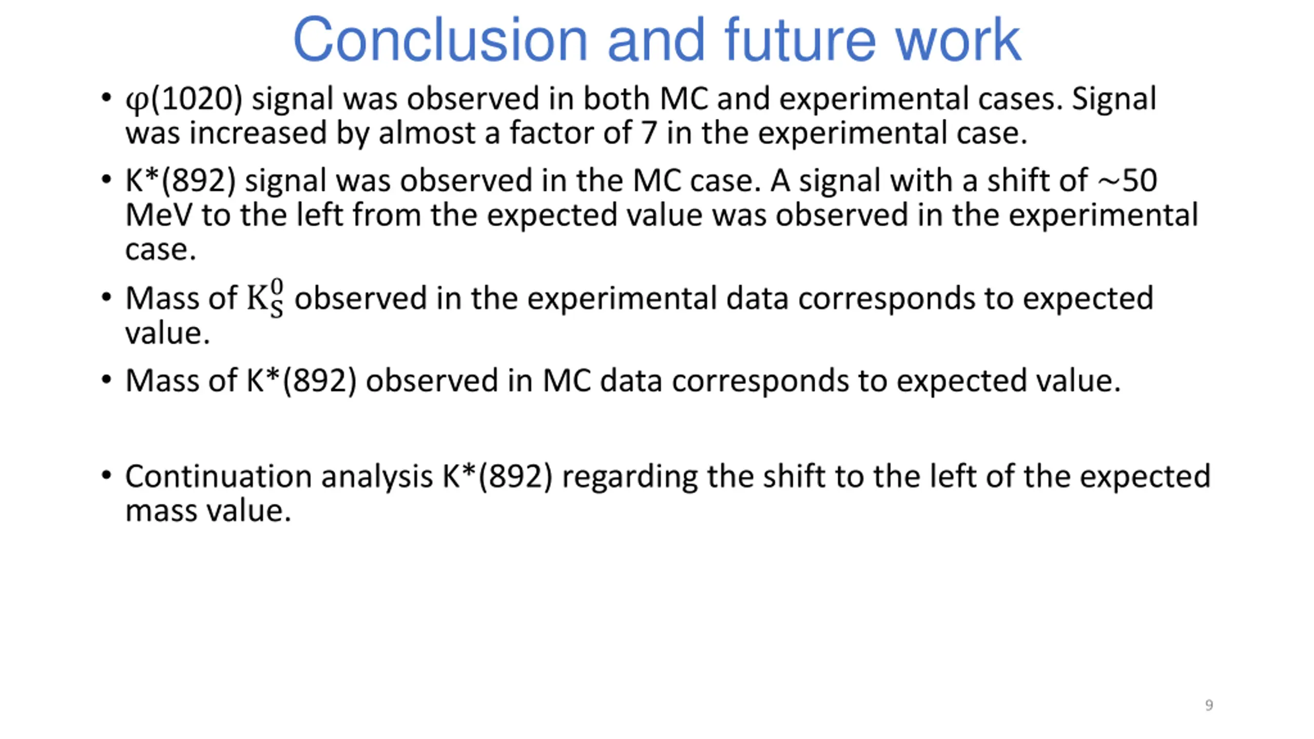 Conclusion and future work (1020) signal was observed in both MC and experimental cases. Signal was increased by almost a factor of 7 in the experimental case. K*(892) signal was observed in the MC case. A signal with a shift of ~50 MeV to the left from the expected value was observed in the experimental case. Mass of KS value. Mass of K*(892) observed in MC data corresponds to expected value. 0observed in the experimental data corresponds to expected Continuation analysis K*(892) regarding the shift to the left of the expected mass value. 9