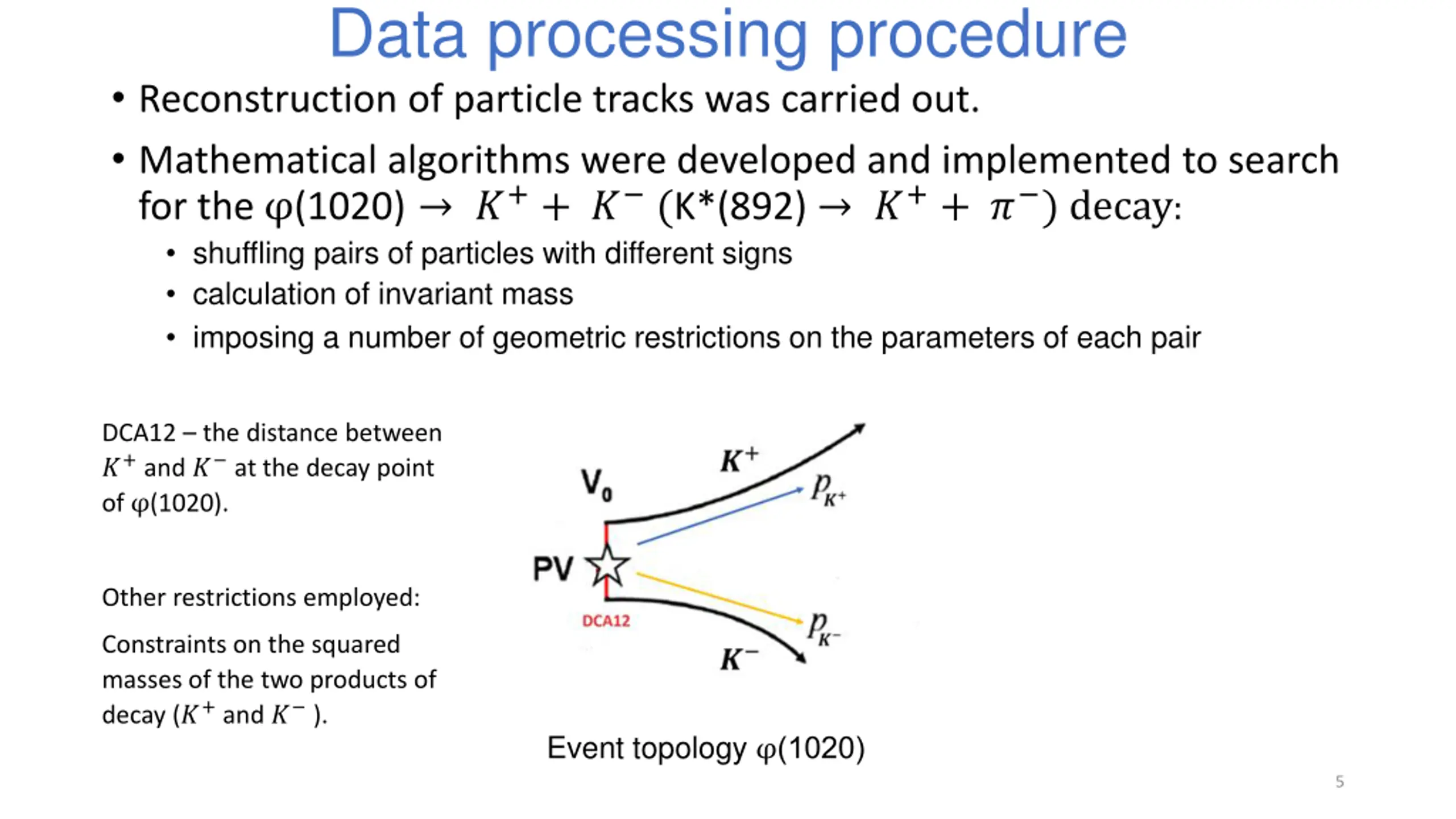 Data processing procedure Reconstruction of particle tracks was carried out. Mathematical algorithms were developed and implemented to search for the (1020) ?++ ? (K*(892) ?++ ? ) decay: shuffling pairs of particles with different signs calculation of invariant mass imposing a number of geometric restrictions on the parameters of each pair DCA12 the distance between ?+and ? at the decay point of (1020). Other restrictions employed: Constraints on the squared masses of the two products of decay (?+and ? ). Event topology (1020) 5