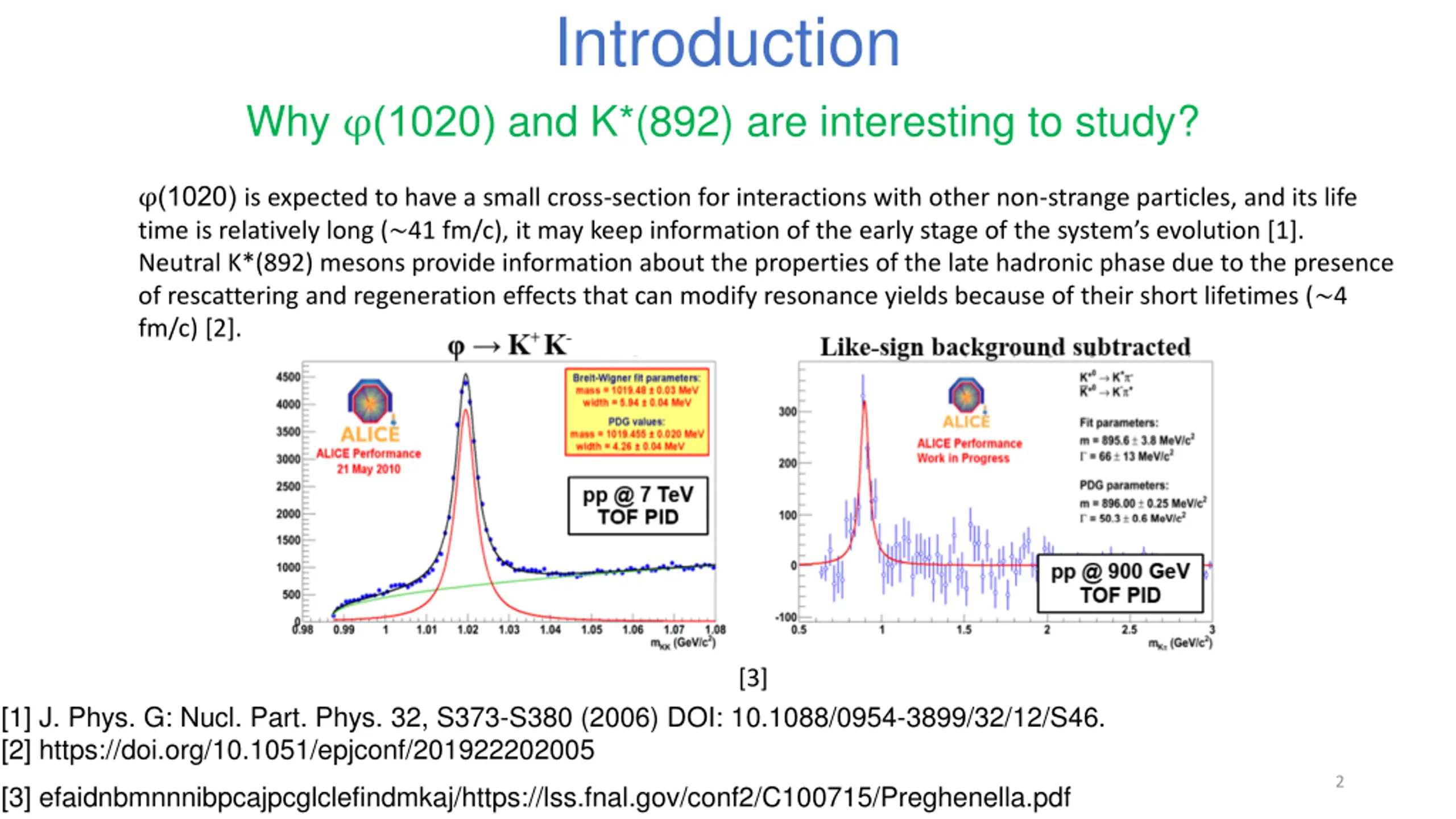 Introduction Why (1020) and K*(892) are interesting to study? (1020) is expected to have a small cross-section for interactions with other non-strange particles, and its life time is relatively long ( 41 fm/c), it may keep information of the early stage of the system s evolution [1]. Neutral K*(892) mesons provide information about the properties of the late hadronic phase due to the presence of rescattering and regeneration effects that can modify resonance yields because of their short lifetimes ( 4 fm/c) [2]. [3] [1] J. Phys. G: Nucl. Part. Phys. 32, S373-S380 (2006) DOI: 10.1088/0954-3899/32/12/S46. [2] https://doi.org/10.1051/epjconf/201922202005 2 [3] efaidnbmnnnibpcajpcglclefindmkaj/https://lss.fnal.gov/conf2/C100715/Preghenella.pdf