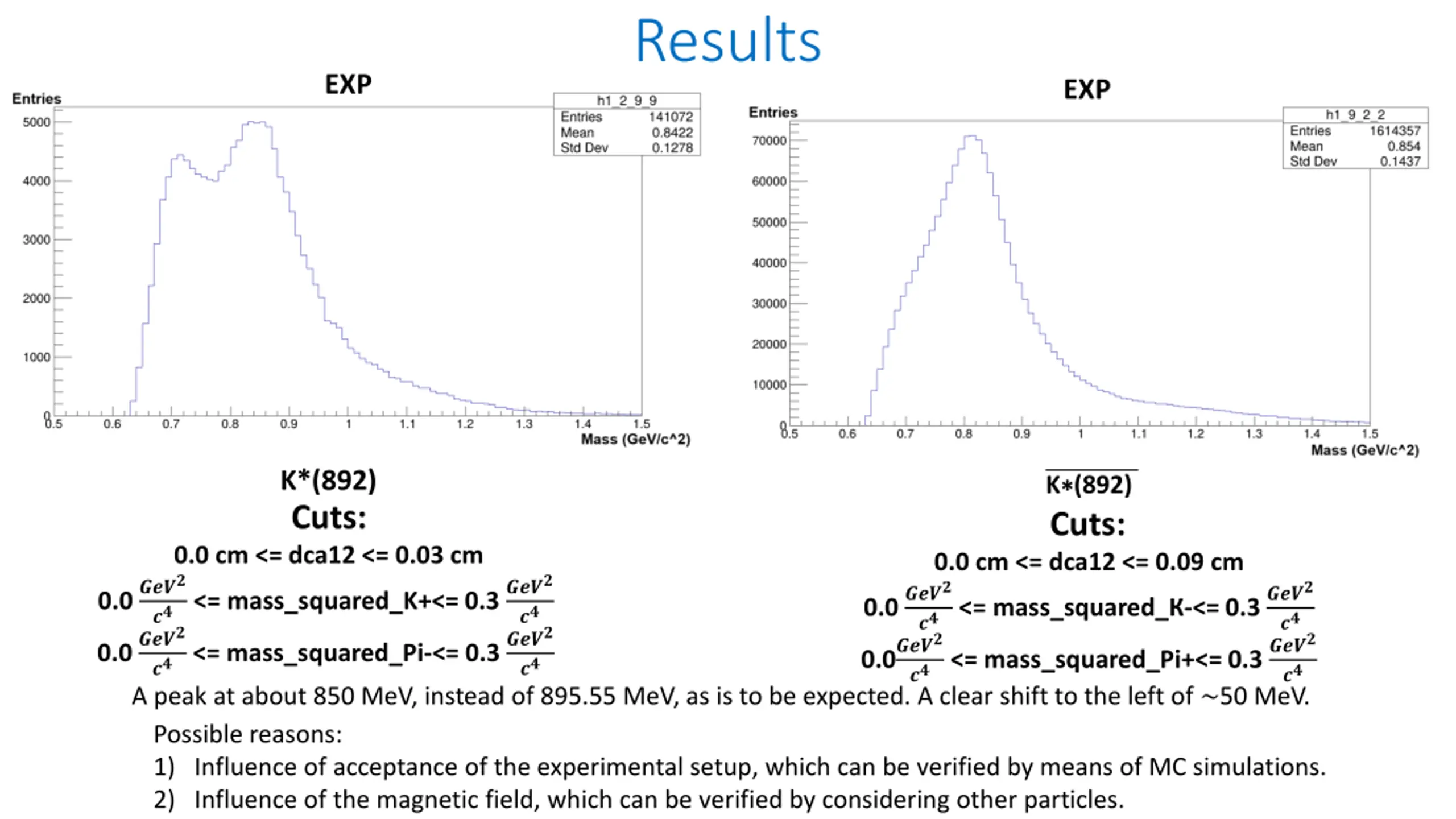 Results EXP EXP K*(892) Cuts: K (892) Cuts: 0.0 cm <= dca12 <= 0.03 cm 0.0 ???? 0.0 ???? 0.0 cm <= dca12 <= 0.09 cm 0.0 ???? 0.0???? ??<= mass_squared_K+<= 0.3 ???? ??<= mass_squared_Pi-<= 0.3 ???? ??<= mass_squared_ -<= 0.3 ???? ??<= mass_squared_Pi+<= 0.3 ???? ?? ?? ?? ?? A peak at about 850 MeV, instead of 895.55 MeV, as is to be expected. A clear shift to the left of ~50 MeV. Possible reasons: 1) Influence of acceptance of the experimental setup, which can be verified by means of MC simulations. 2) Influence of the magnetic field, which can be verified by considering other particles.