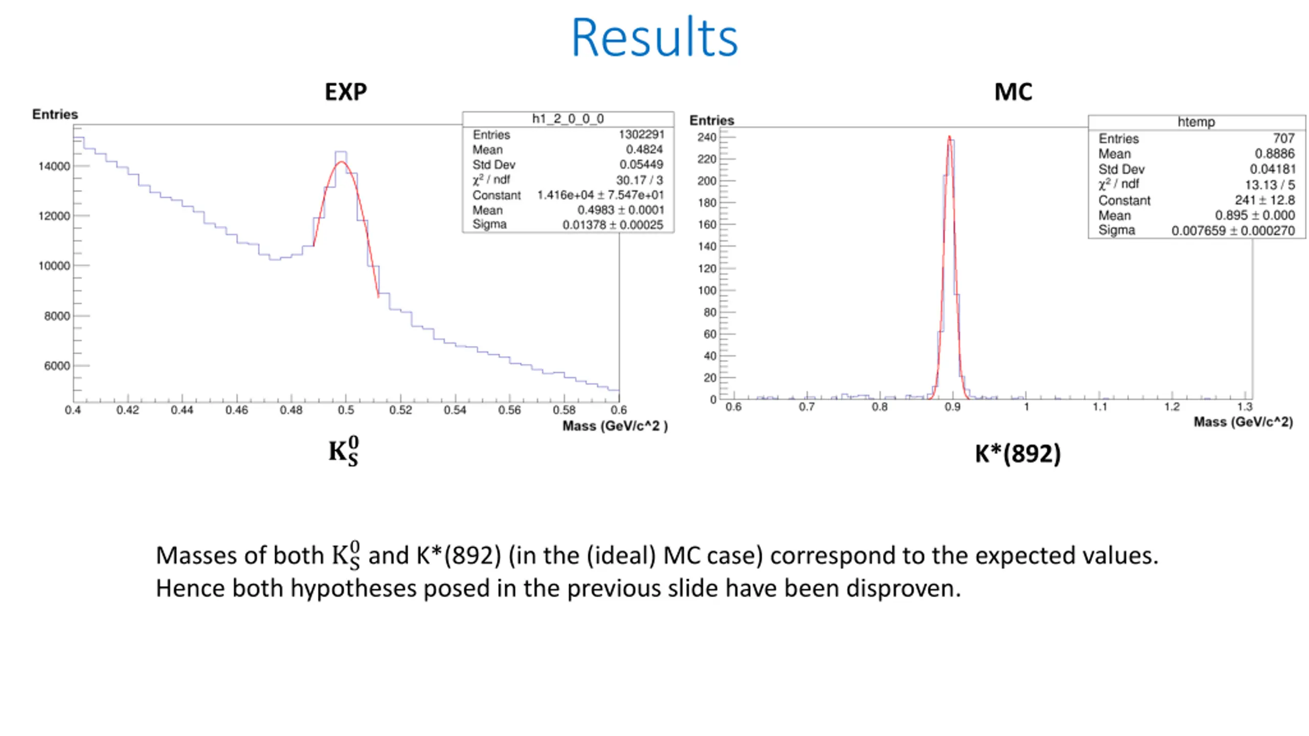 Results EXP MC ? ?? K*(892) 0and K*(892) (in the (ideal) MC case) correspond to the expected values. Masses of both KS Hence both hypotheses posed in the previous slide have been disproven.
