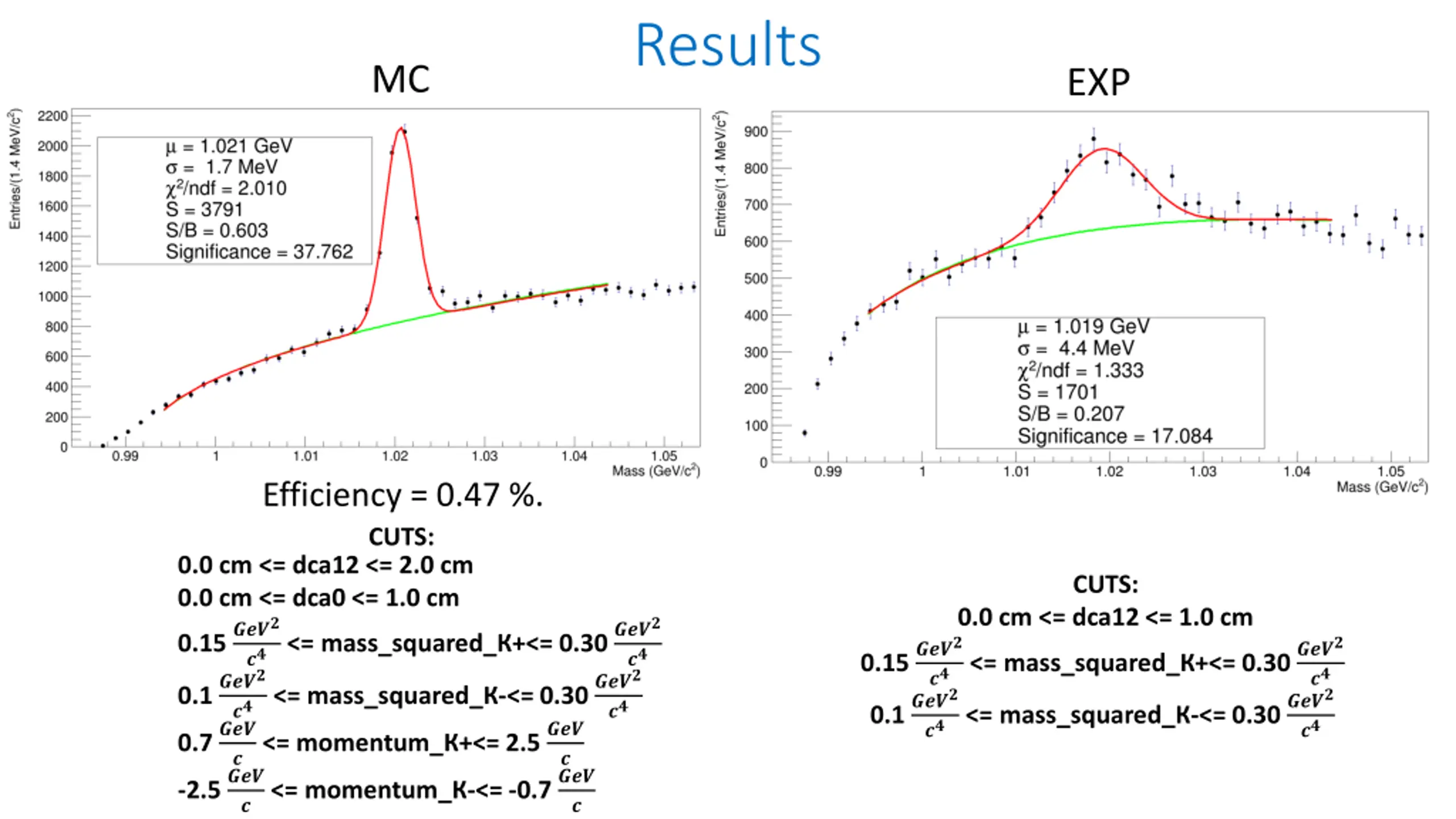 Results MC EXP Efficiency = 0.47 %. CUTS: 0.0 cm <= dca12 <= 2.0 cm 0.0 cm <= dca0 <= 1.0 cm 0.15 ???? 0.1 ???? 0.7 ??? -2.5 ??? CUTS: 0.0 cm <= dca12 <= 1.0 cm 0.15 ???? 0.1 ???? ??<= mass_squared_ +<= 0.30 ???? ??<= mass_squared_ -<= 0.30 ???? ?<= momentum_ +<= 2.5 ??? ?<= momentum_ -<= -0.7 ??? ??<= mass_squared_ +<= 0.30 ???? ??<= mass_squared_ -<= 0.30 ???? ?? ?? ?? ?? ? ?