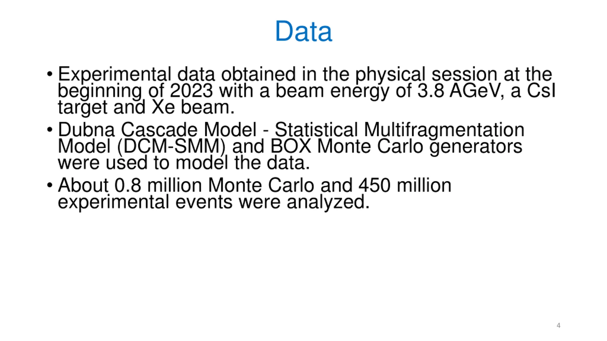 Data Experimental data obtained in the physical session at the beginning of 2023 with a beam energy of 3.8 AGeV, a CsI target and Xe beam. Dubna Cascade Model - Statistical Multifragmentation Model (DCM-SMM) and BOX Monte Carlo generators were used to model the data. About 0.8 million Monte Carlo and 450 million experimental events were analyzed. 4