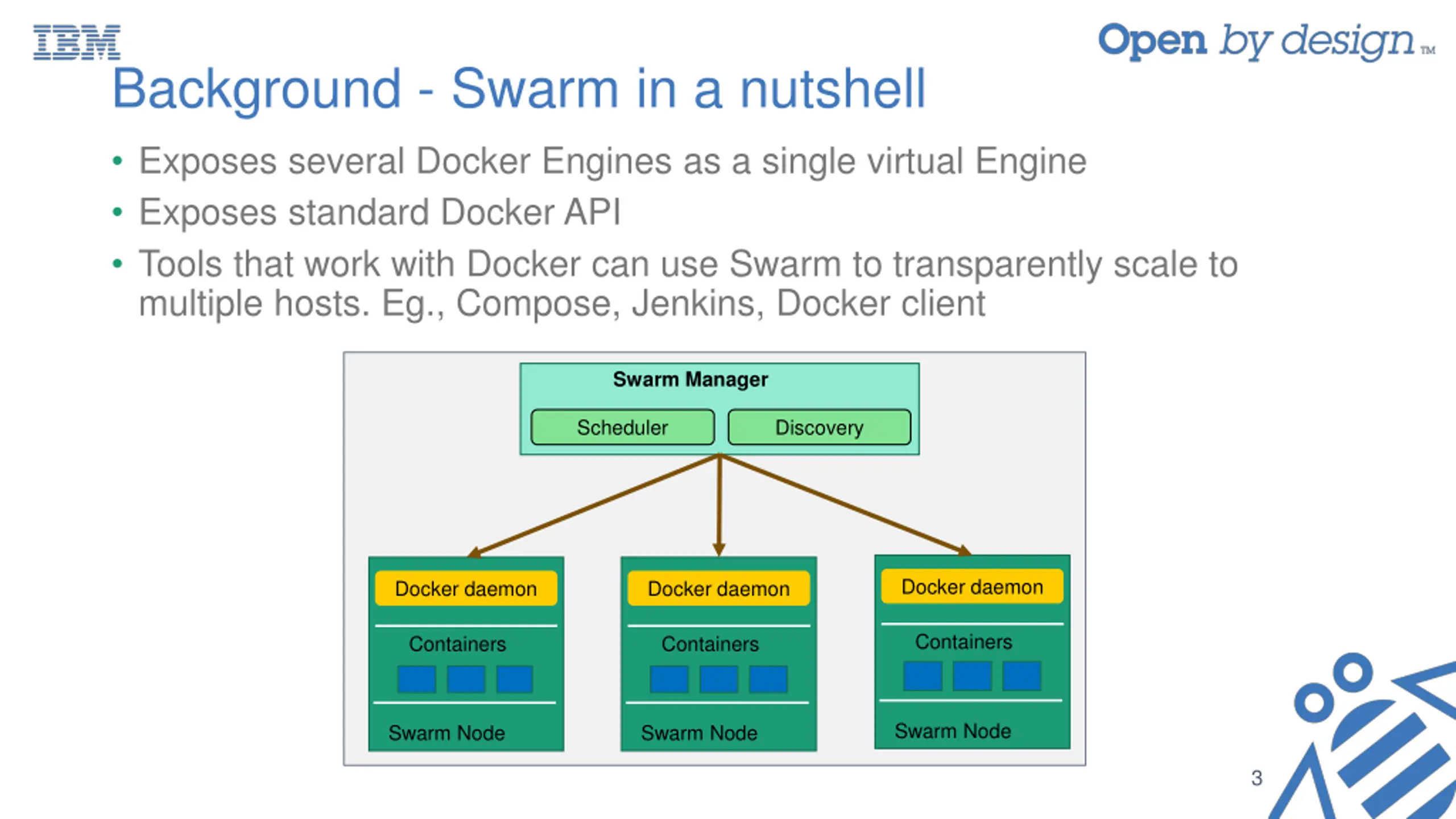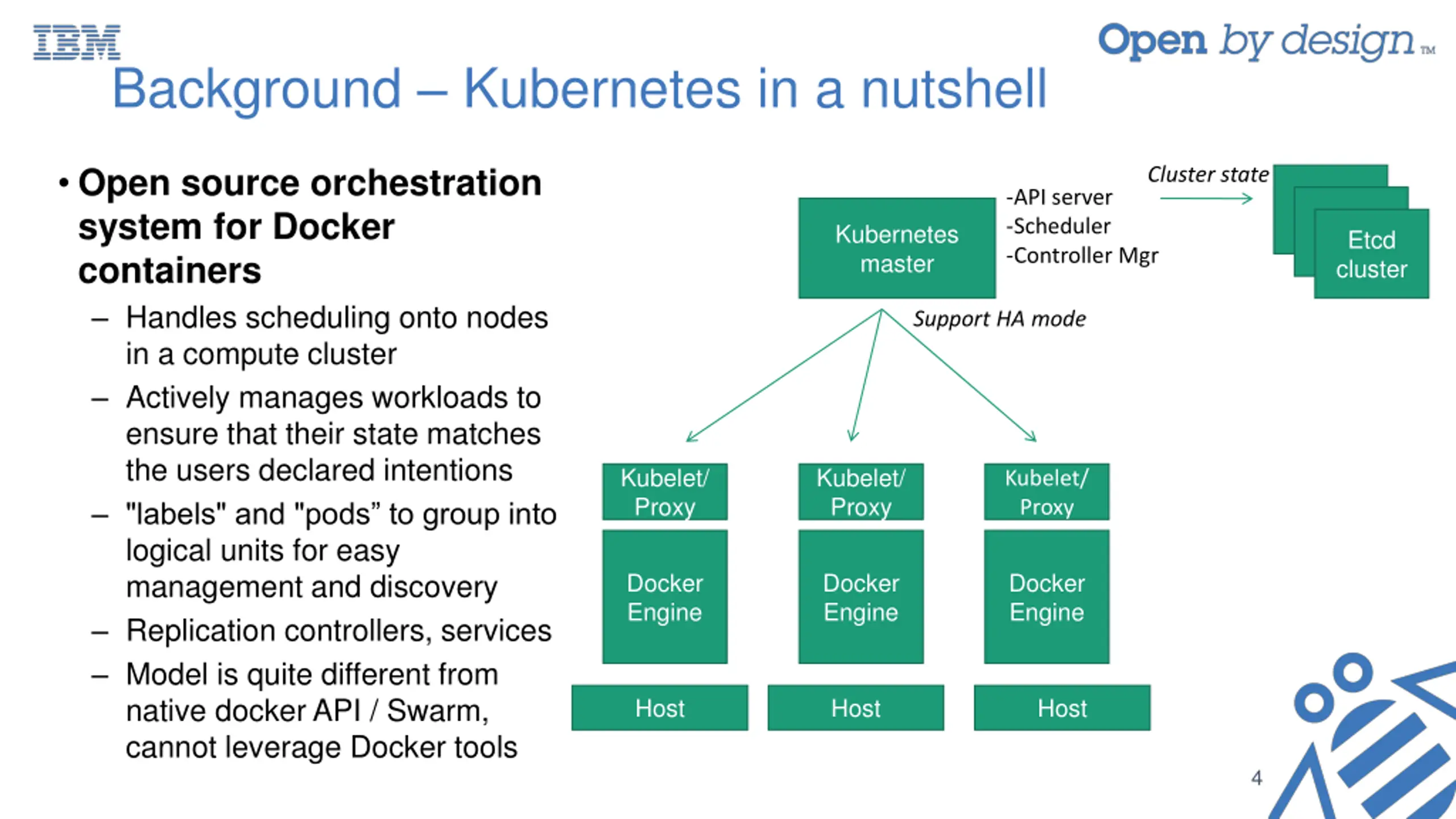 Background - Swarm in a nutshell Exposes several Docker Engines as a single virtual Engine Exposes standard Docker API Tools that work with Docker can use Swarm to transparently scale to multiple hosts. Eg., Compose, Jenkins, Docker client Swarm Manager Scheduler Discovery Docker daemon Docker daemon Docker daemon Containers Containers Containers Swarm Node Swarm Node Swarm Node 3