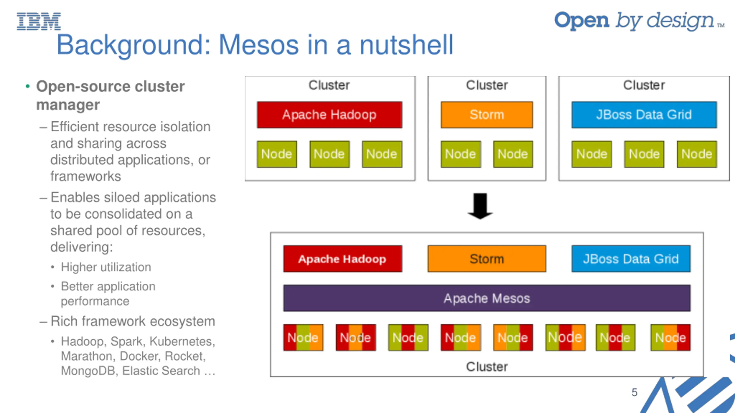 Background: Mesos in a nutshell Open-source cluster manager Efficient resource isolation and sharing across distributed applications, or frameworks Enables siloed applications to be consolidated on a shared pool of resources, delivering: Higher utilization Better application performance Rich framework ecosystem Hadoop, Spark, Kubernetes, Marathon, Docker, Rocket, MongoDB, Elastic Search 5