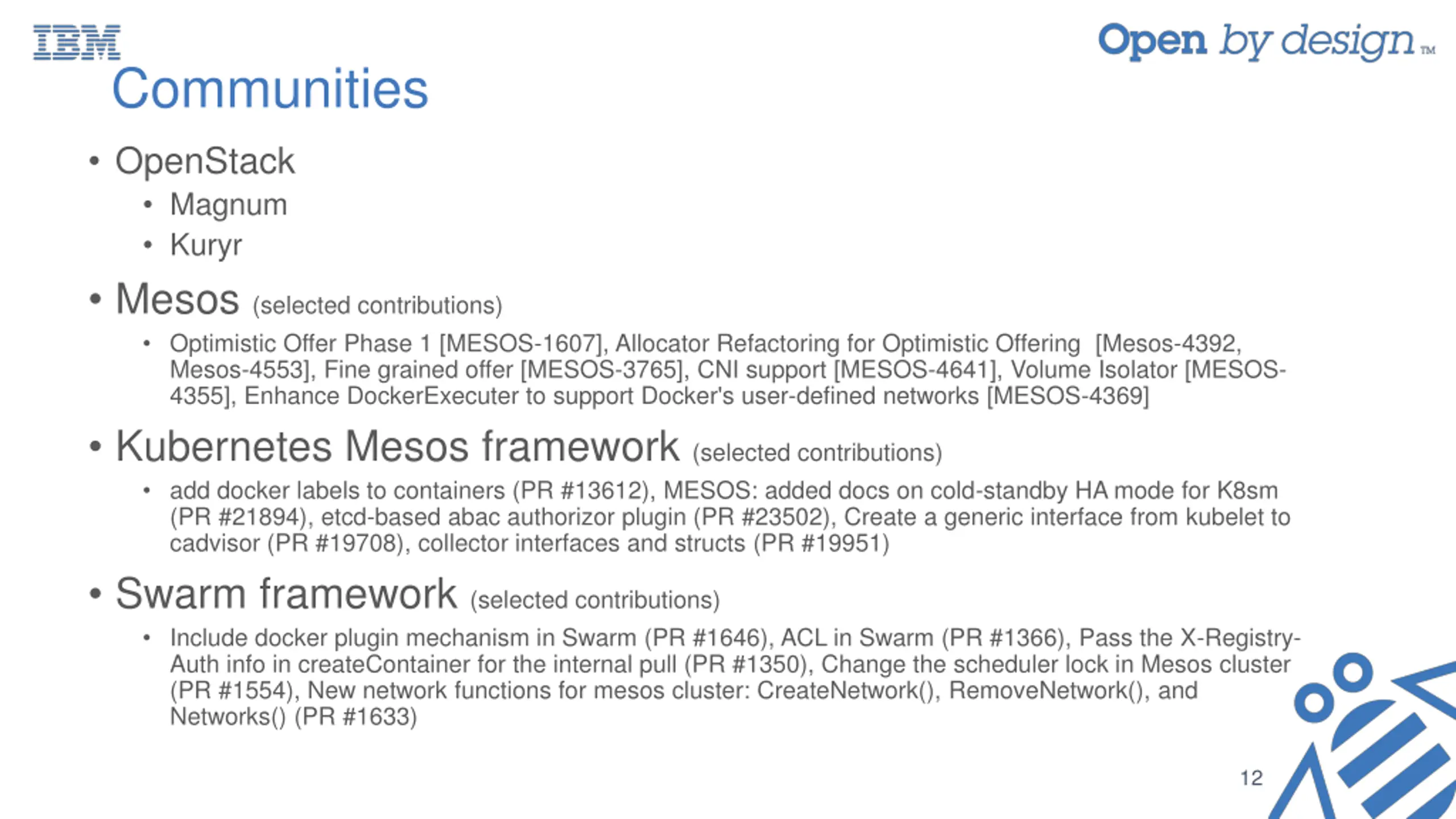 Communities OpenStack Magnum Kuryr Mesos (selected contributions) Optimistic Offer Phase 1 [MESOS-1607], Allocator Refactoring for Optimistic Offering [Mesos-4392, Mesos-4553], Fine grained offer [MESOS-3765], CNI support [MESOS-4641], Volume Isolator [MESOS- 4355], Enhance DockerExecuter to support Docker's user-defined networks [MESOS-4369] Kubernetes Mesos framework (selected contributions) add docker labels to containers (PR #13612), MESOS: added docs on cold-standby HA mode for K8sm (PR #21894), etcd-based abac authorizor plugin (PR #23502), Create a generic interface from kubelet to cadvisor (PR #19708), collector interfaces and structs (PR #19951) Swarm framework (selected contributions) Include docker plugin mechanism in Swarm (PR #1646), ACL in Swarm (PR #1366), Pass the X-Registry- Auth info in createContainer for the internal pull (PR #1350), Change the scheduler lock in Mesos cluster (PR #1554), New network functions for mesos cluster: CreateNetwork(), RemoveNetwork(), and Networks() (PR #1633) 12