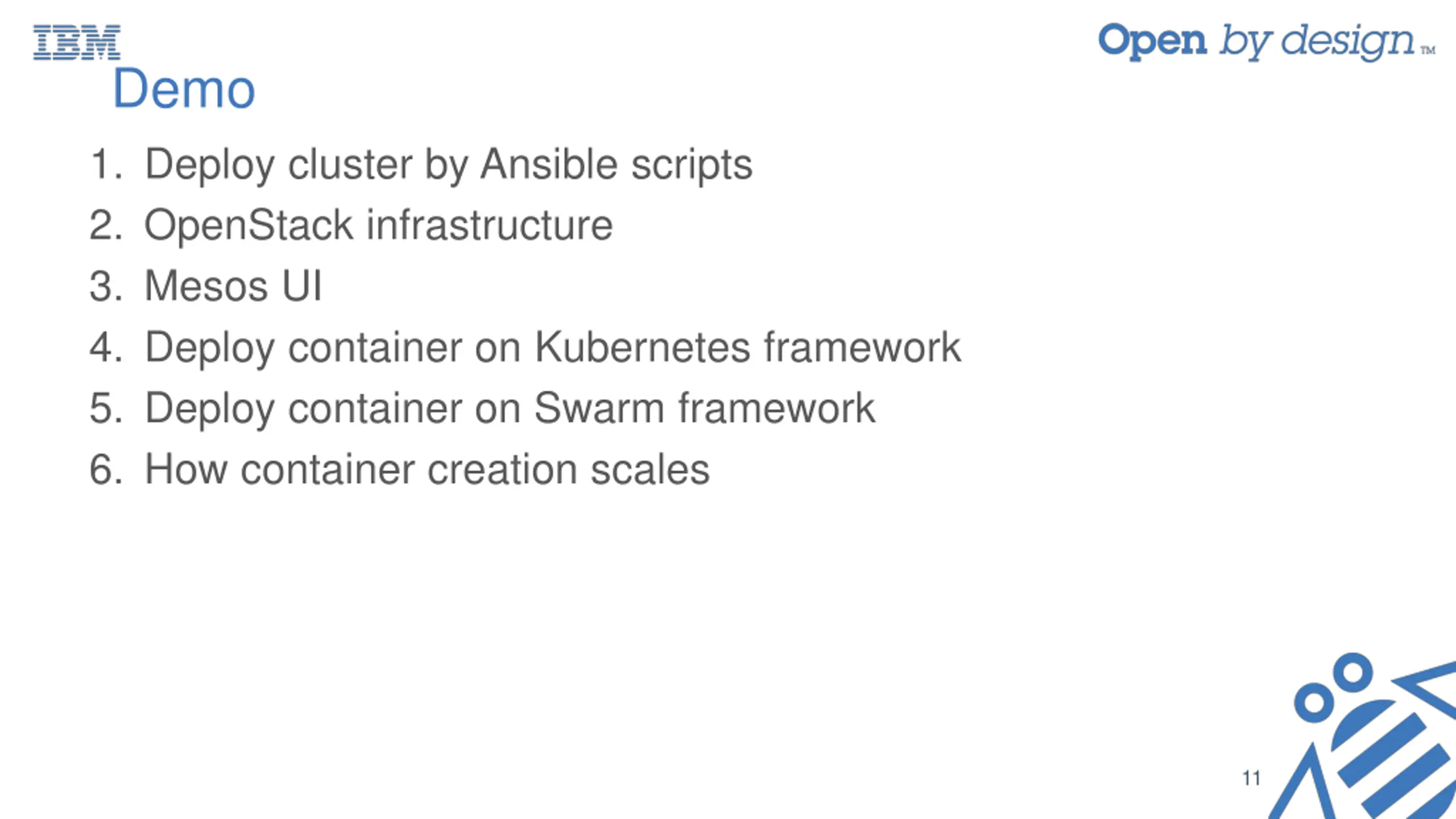 Demo 1. Deploy cluster by Ansible scripts 2. OpenStack infrastructure 3. Mesos UI 4. Deploy container on Kubernetes framework 5. Deploy container on Swarm framework 6. How container creation scales 11