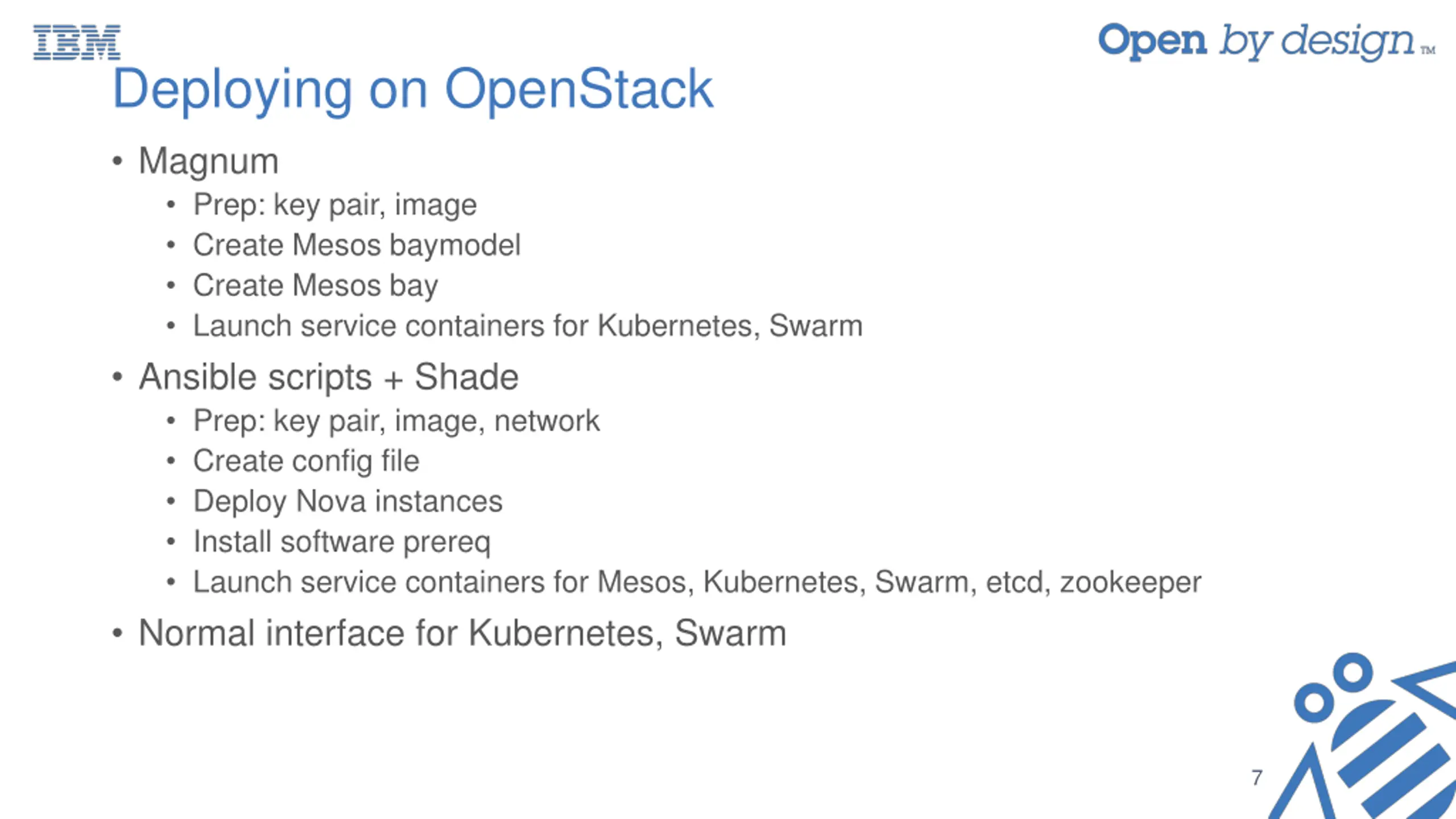 Deploying on OpenStack Magnum Prep: key pair, image Create Mesos baymodel Create Mesos bay Launch service containers for Kubernetes, Swarm Ansible scripts + Shade Prep: key pair, image, network Create config file Deploy Nova instances Install software prereq Launch service containers for Mesos, Kubernetes, Swarm, etcd, zookeeper Normal interface for Kubernetes, Swarm 7