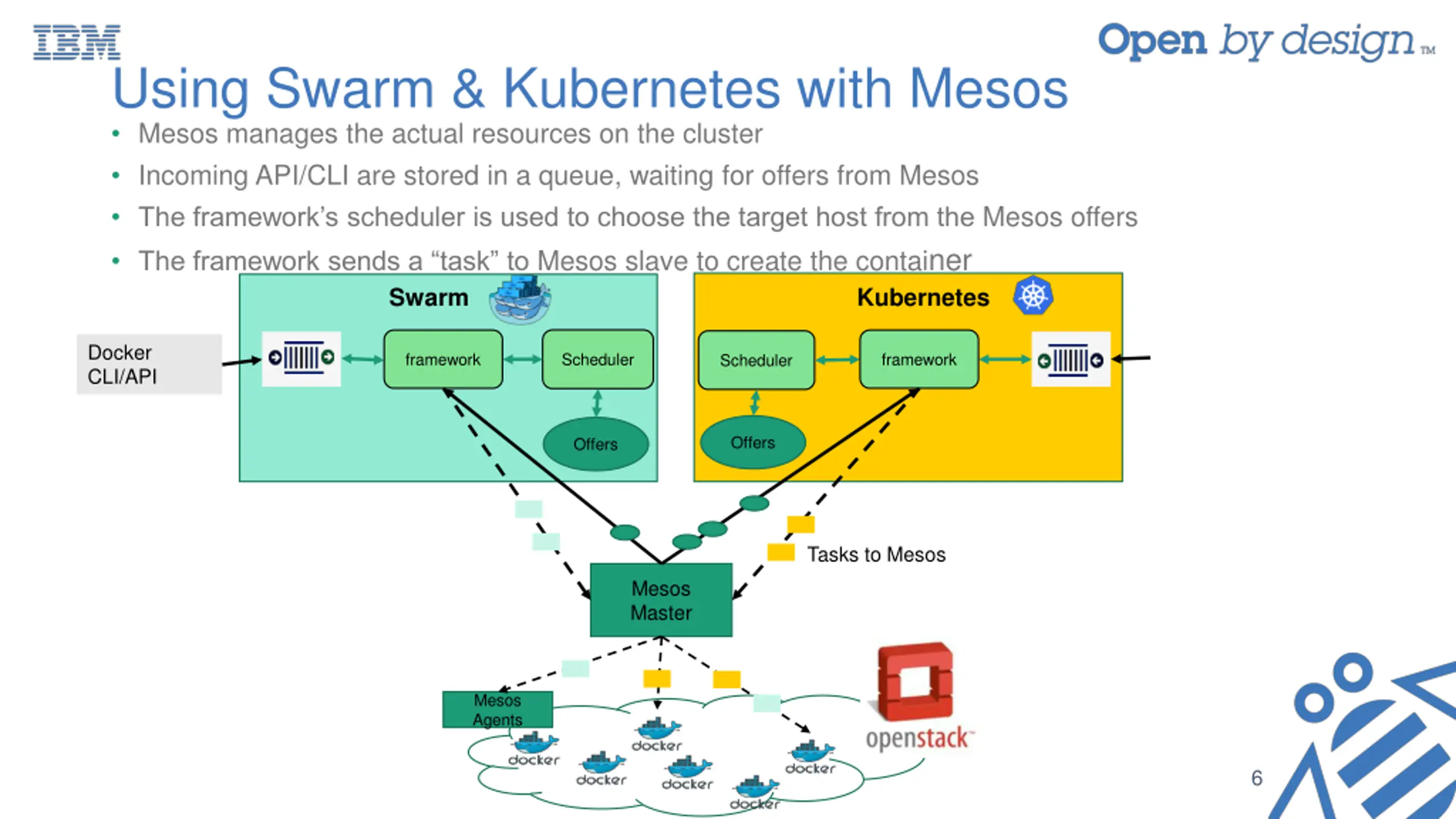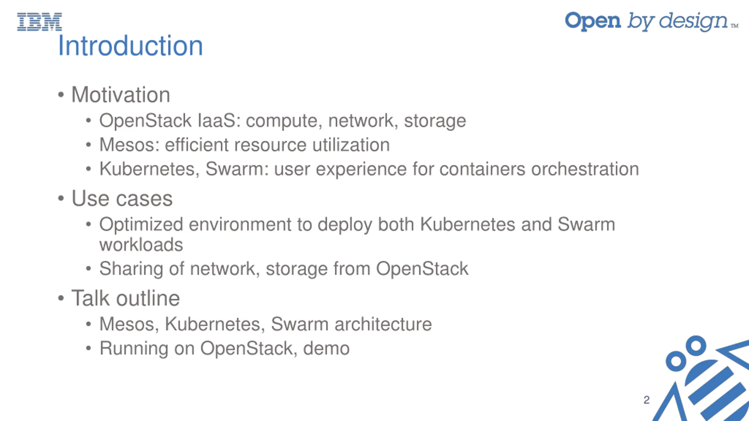 Introduction Motivation OpenStack IaaS: compute, network, storage Mesos: efficient resource utilization Kubernetes, Swarm: user experience for containers orchestration Use cases Optimized environment to deploy both Kubernetes and Swarm workloads Sharing of network, storage from OpenStack Talk outline Mesos, Kubernetes, Swarm architecture Running on OpenStack, demo 2