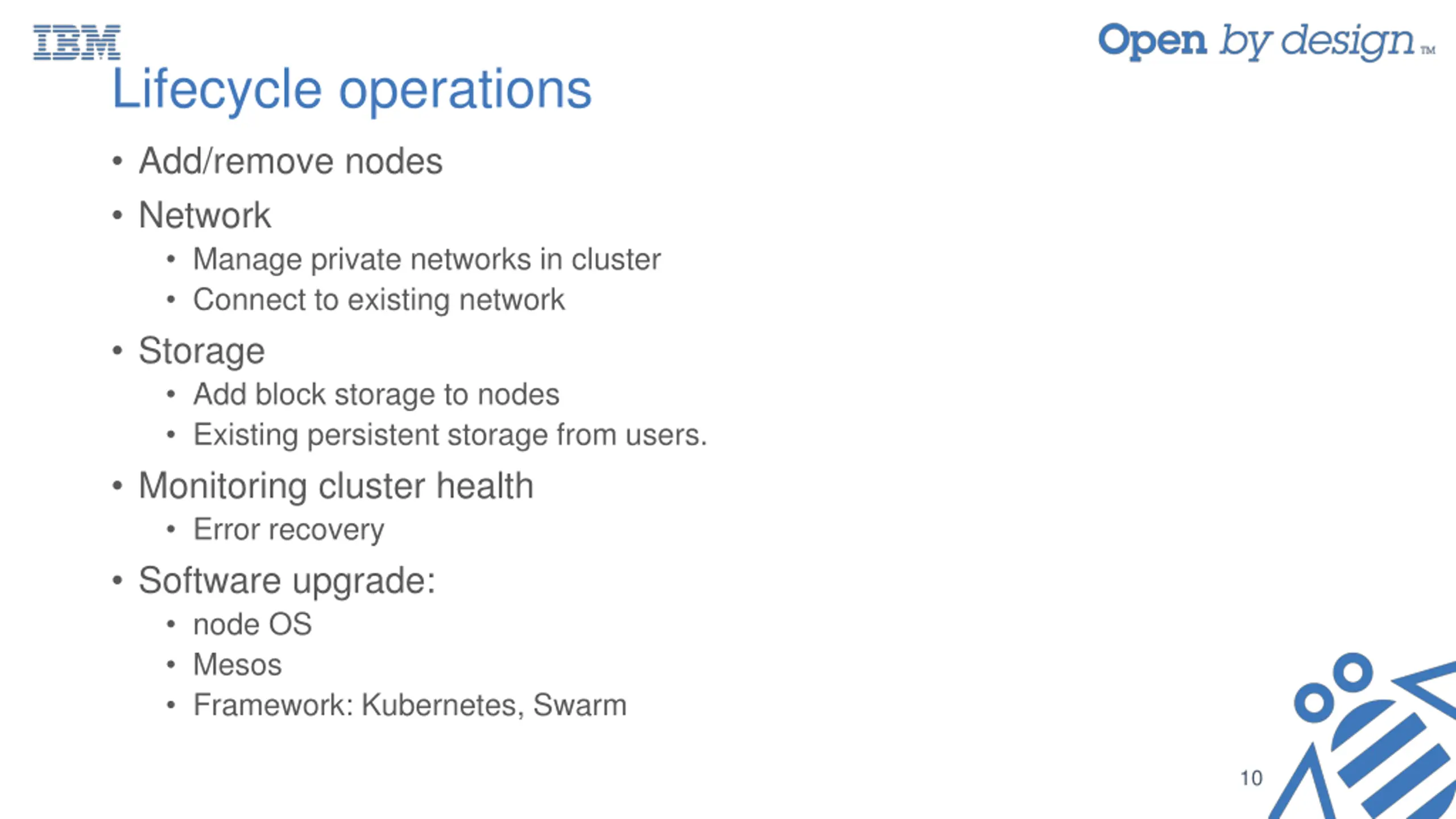 Lifecycle operations Add/remove nodes Network Manage private networks in cluster Connect to existing network Storage Add block storage to nodes Existing persistent storage from users. Monitoring cluster health Error recovery Software upgrade: node OS Mesos Framework: Kubernetes, Swarm 10