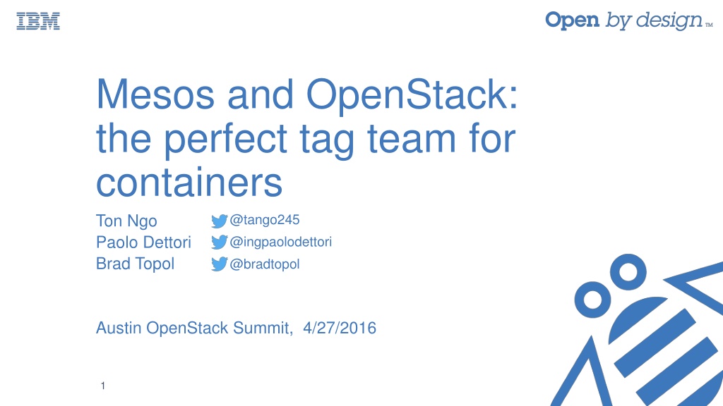 Mesos and OpenStack: the perfect tag team for containers Ton Ngo Paolo Dettori Brad Topol @bradtopol @tango245 @ingpaolodettori Austin OpenStack Summit, 4/27/2016 1