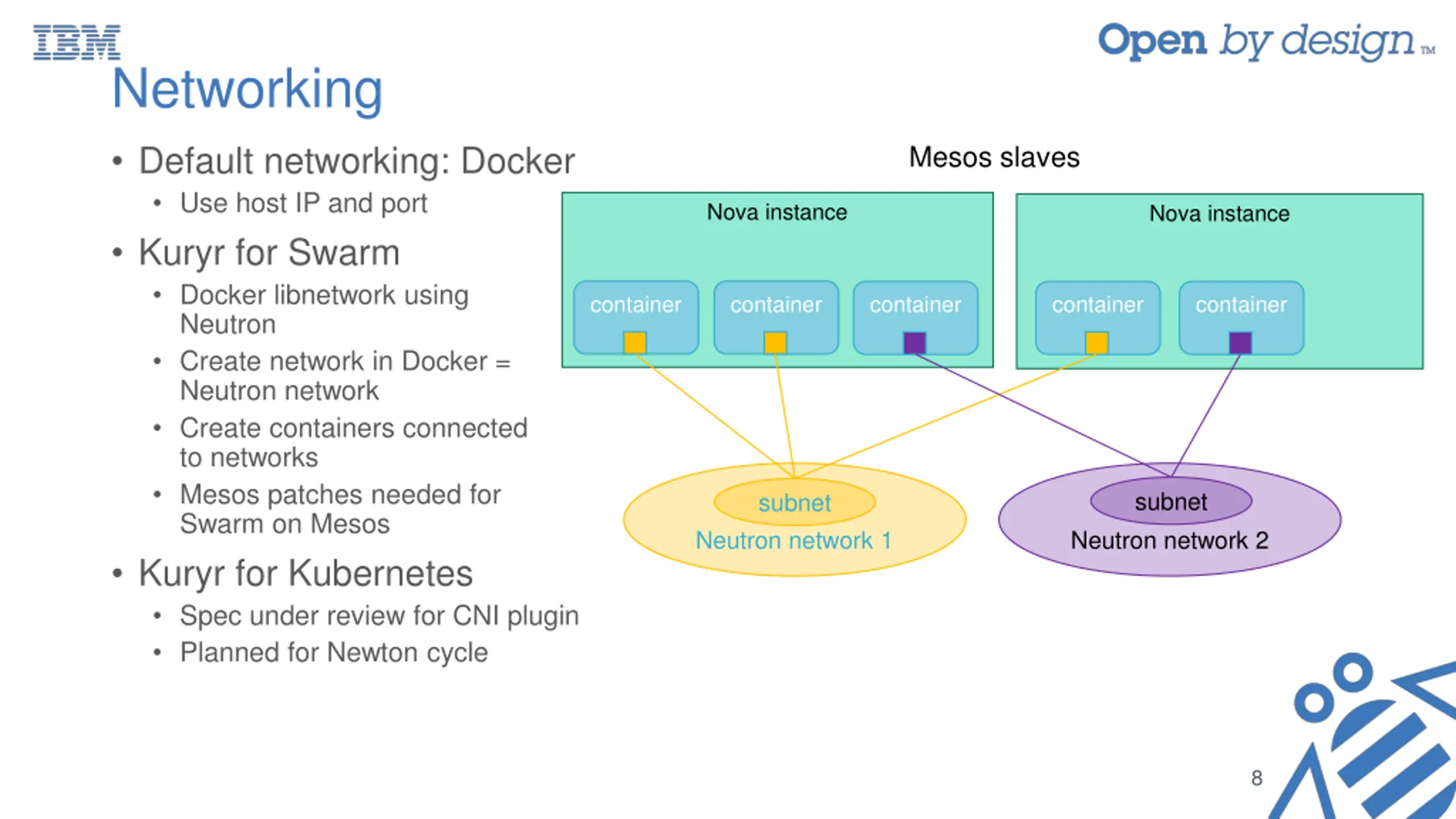 Networking Default networking: Docker Use host IP and port Kuryr for Swarm Docker libnetwork using Neutron Create network in Docker = Neutron network Create containers connected to networks Mesos patches needed for Swarm on Mesos Kuryr for Kubernetes Spec under review for CNI plugin Planned for Newton cycle Mesos slaves Nova instance Nova instance container container container container container subnet subnet Neutron network 1 Neutron network 2 8