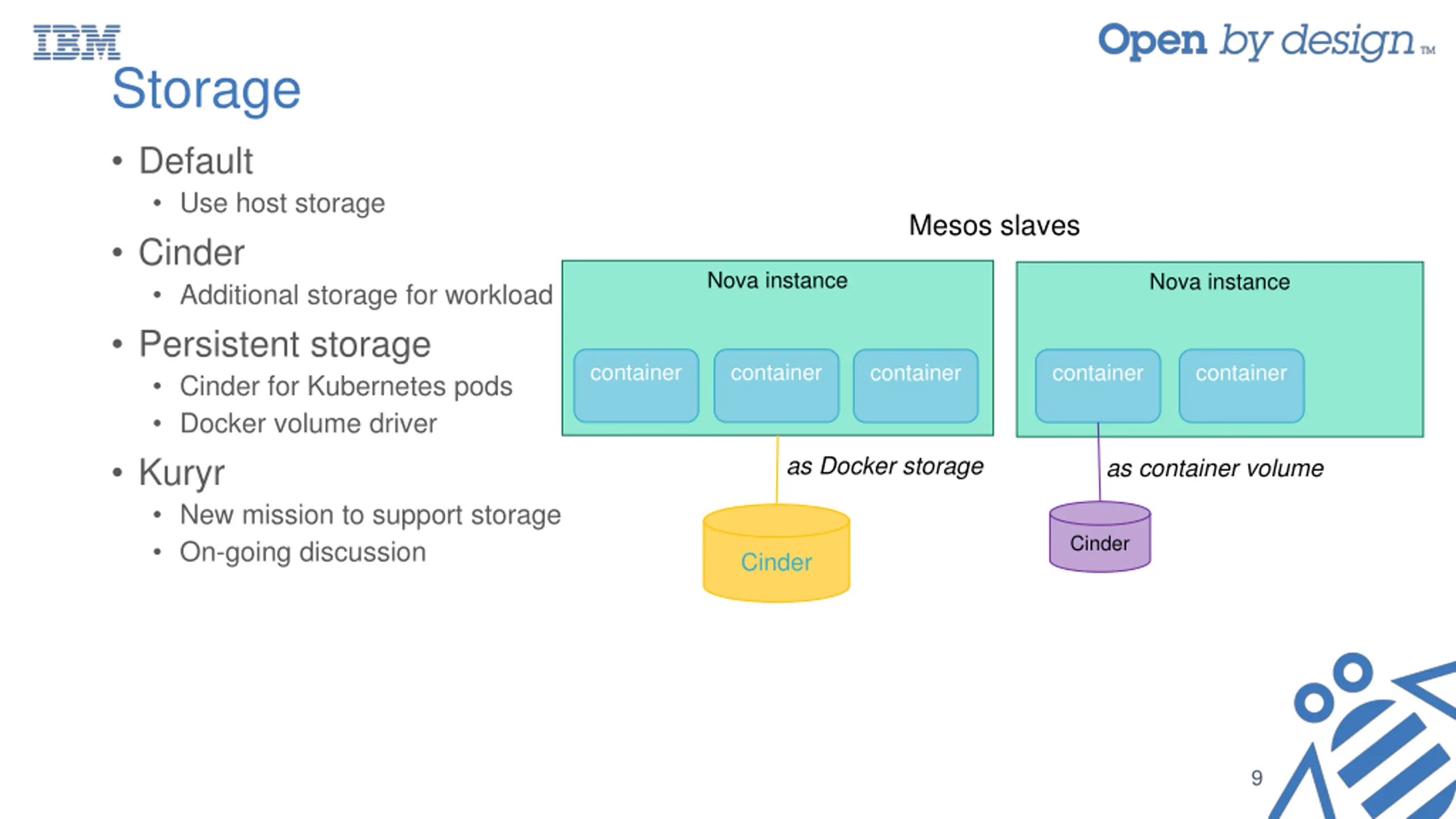Storage Default Use host storage Cinder Additional storage for workload Persistent storage Cinder for Kubernetes pods Docker volume driver Kuryr New mission to support storage On-going discussion Mesos slaves Nova instance Nova instance container container container container container as Docker storage as container volume Cinder Cinder 9