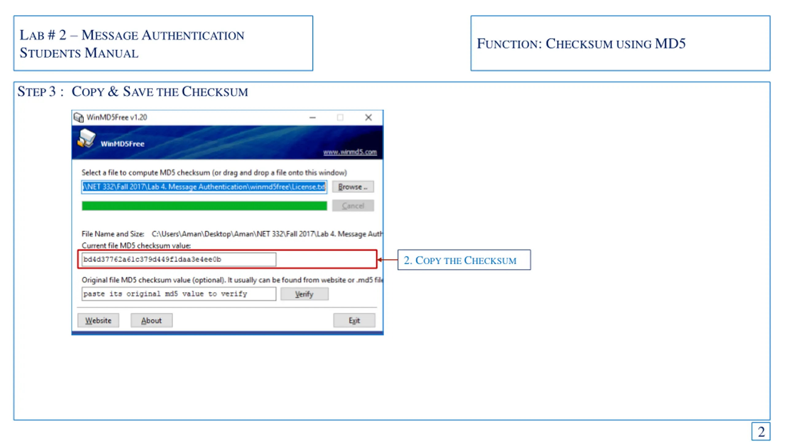 LAB # 2 MESSAGE AUTHENTICATION STUDENTS MANUAL FUNCTION: CHECKSUM USING MD5 STEP 3 : COPY & SAVE THE CHECKSUM 2. COPY THE CHECKSUM 2