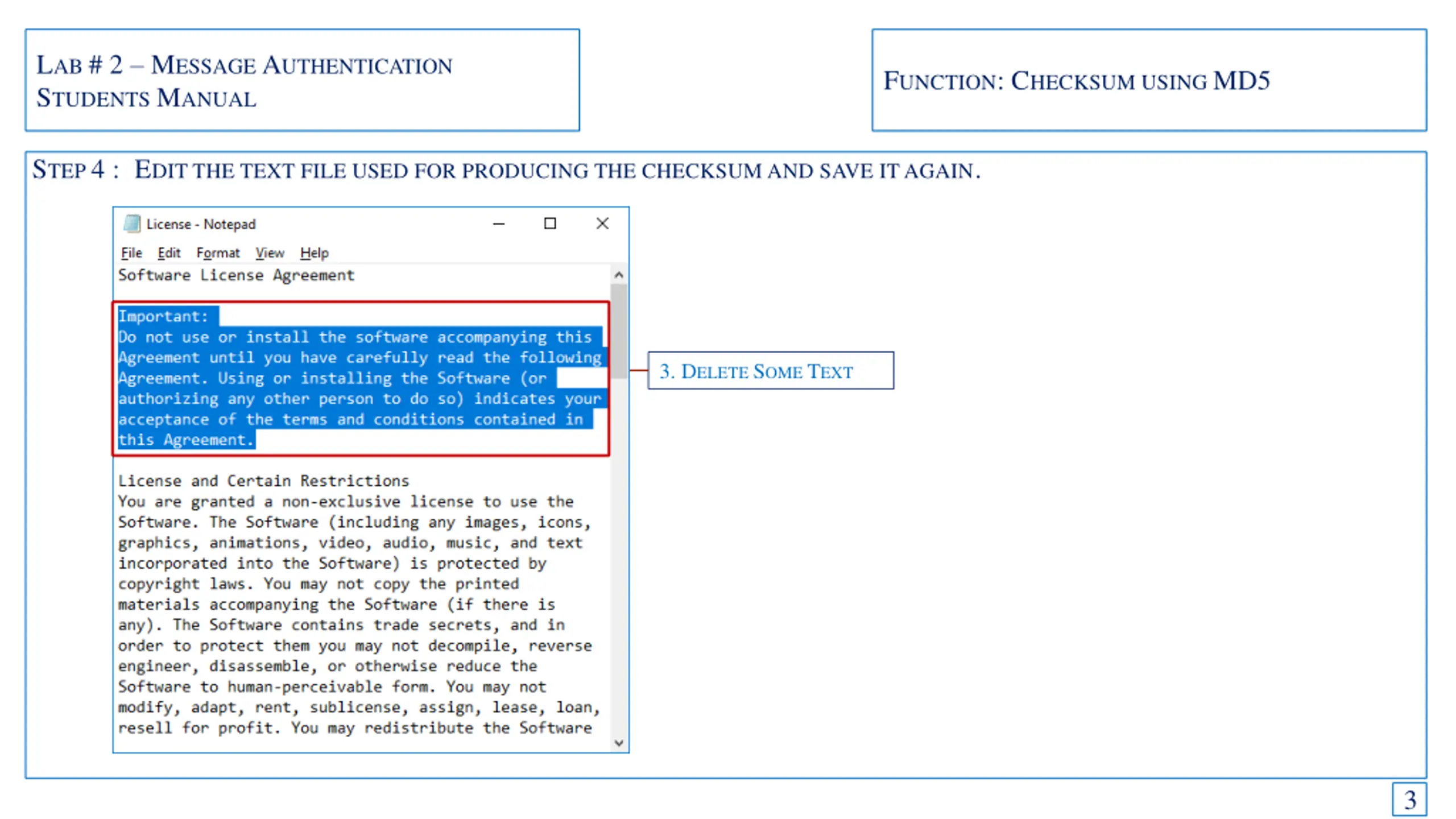 LAB # 2 MESSAGE AUTHENTICATION STUDENTS MANUAL FUNCTION: CHECKSUM USING MD5 STEP 4 : EDIT THE TEXT FILE USED FOR PRODUCING THE CHECKSUM AND SAVE IT AGAIN. 3. DELETE SOME TEXT 3