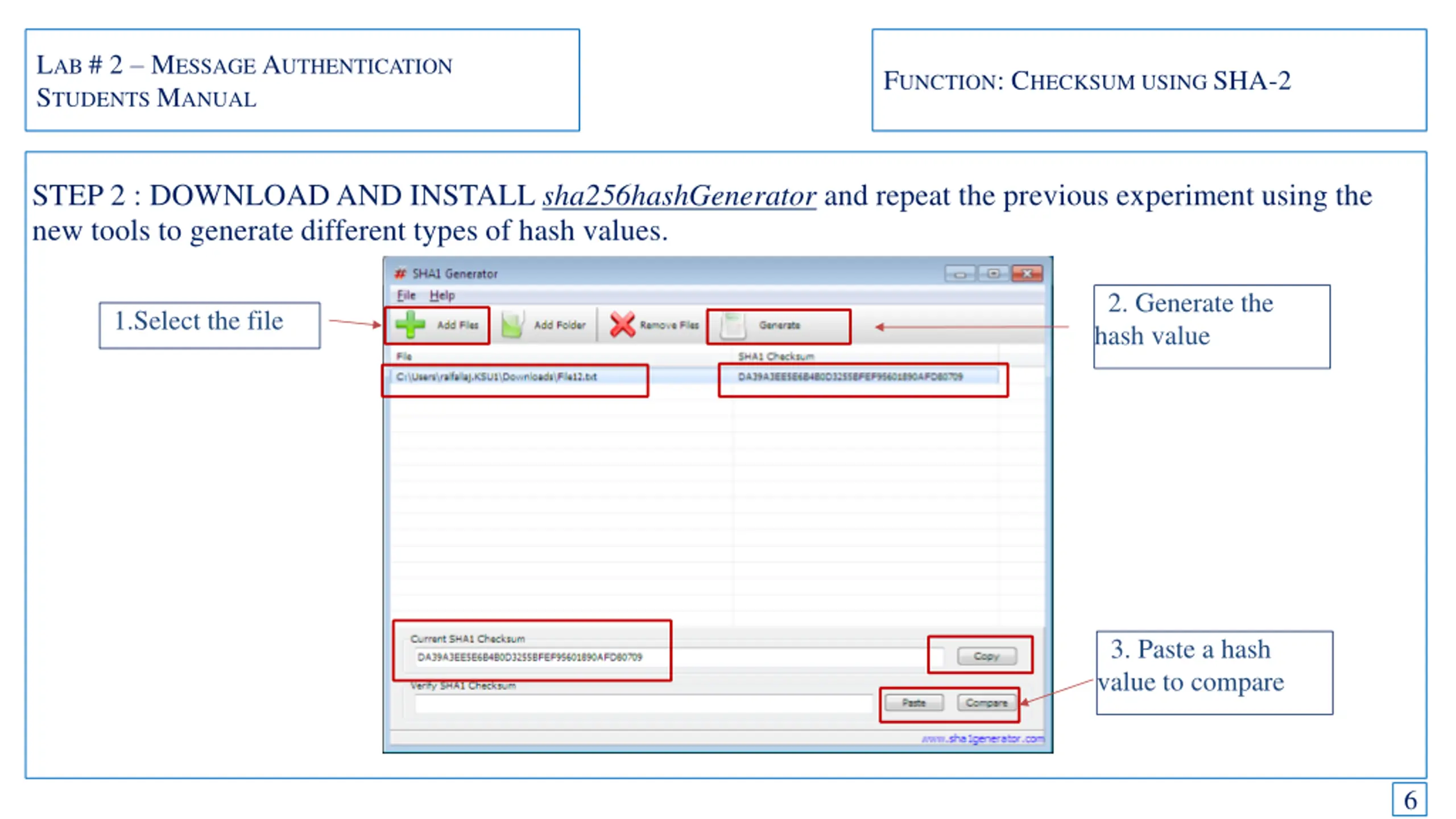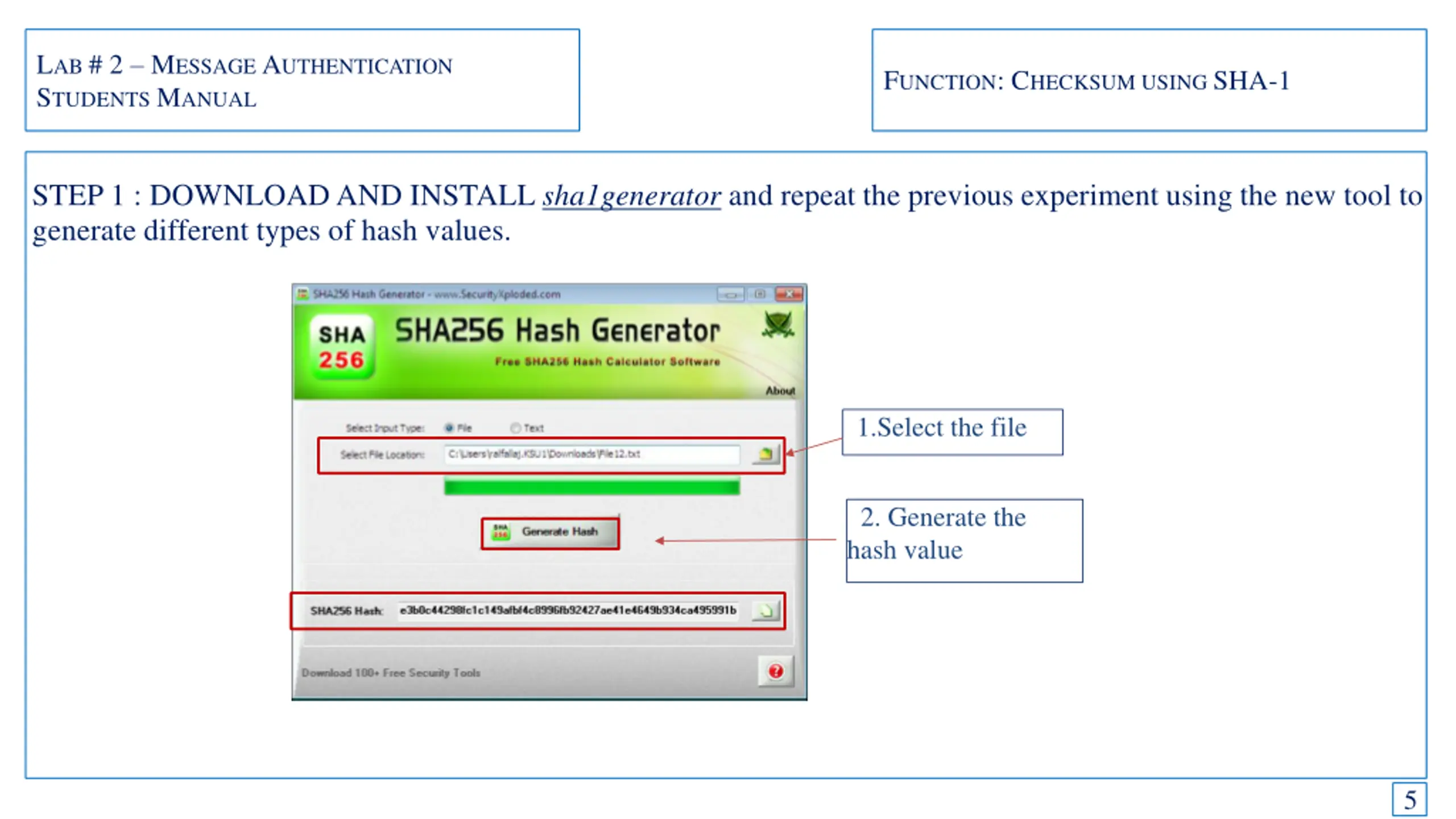 LAB # 2 MESSAGE AUTHENTICATION STUDENTS MANUAL FUNCTION: CHECKSUM USING SHA-1 STEP 1 : DOWNLOAD AND INSTALL sha1generator and repeat the previous experiment using the new tool to generate different types of hash values. 1.Select the file 2. Generate the hash value 5
