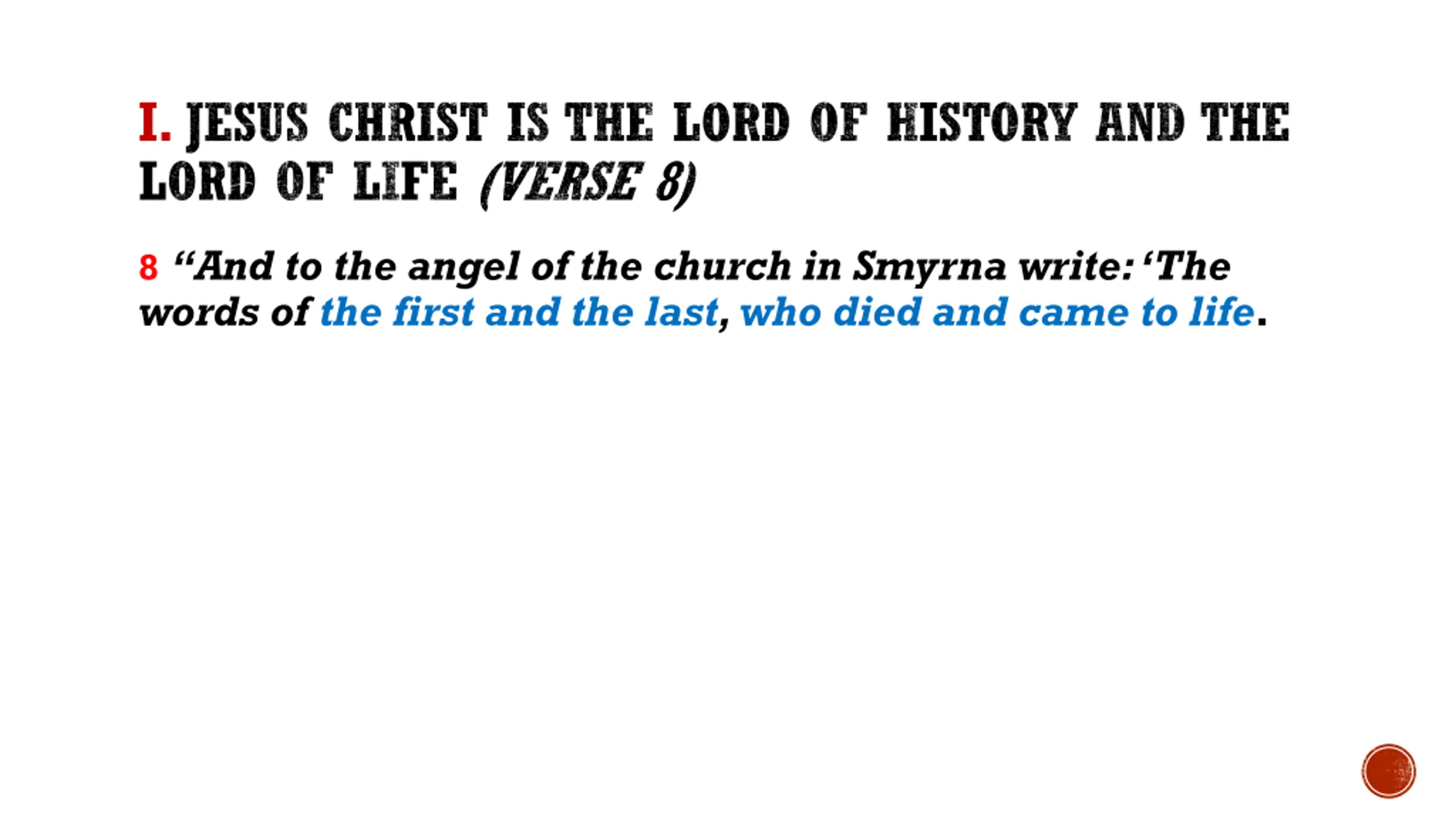 I. JESUS CHRIST IS THE LORD OF HISTORY AND THE LORD OF LIFE (VERSE 8) 8 And to the angel of the church in Smyrna write: The words of the first and the last, who died and came to life.