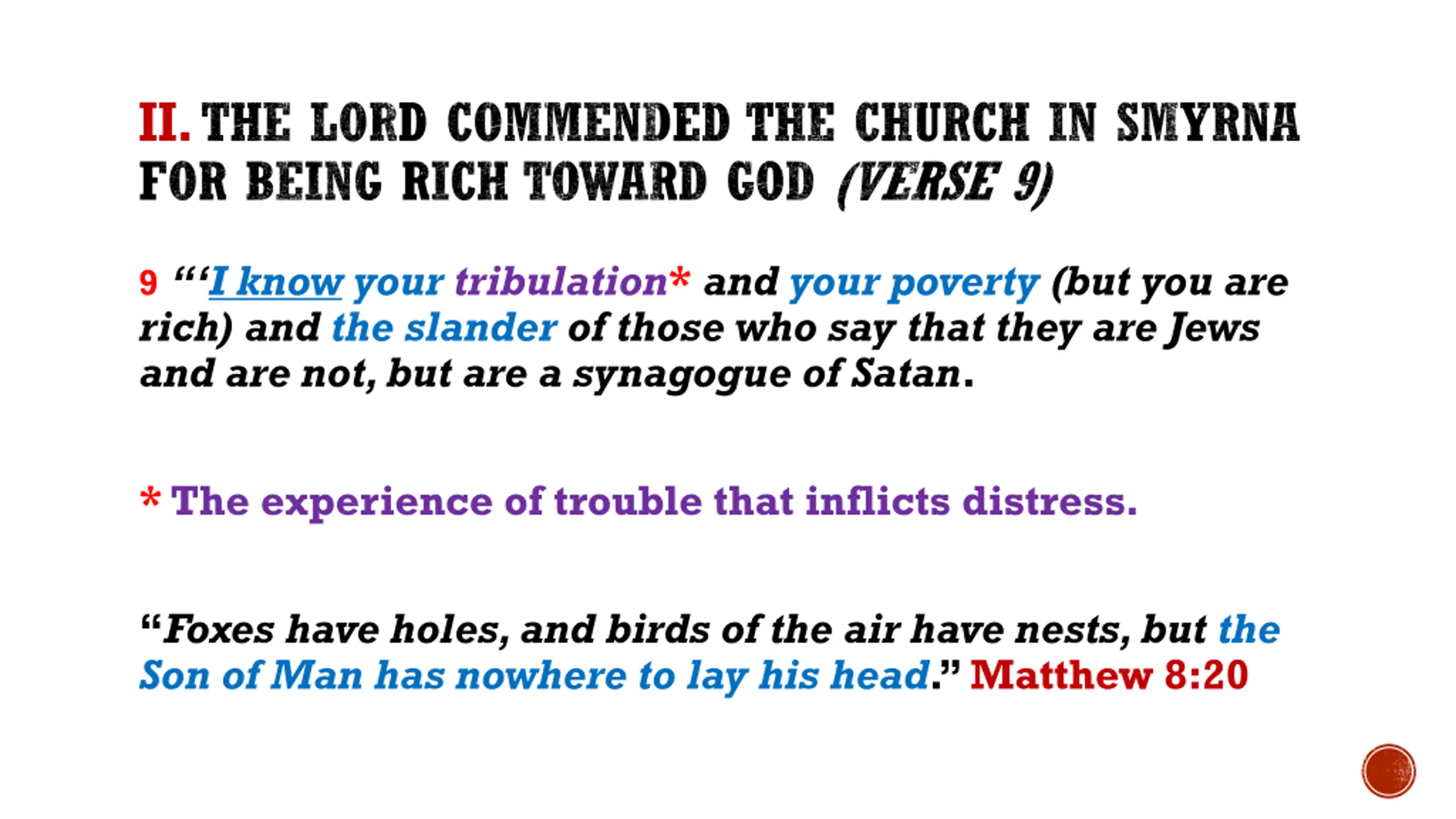 II. THE LORD COMMENDED THE CHURCH IN SMYRNA FOR BEING RICH TOWARD GOD (VERSE 9) 9 I know your tribulation* and your poverty (but you are rich) and the slander of those who say that they are Jews and are not, but are a synagogue of Satan. * The experience of trouble that inflicts distress. Foxes have holes, and birds of the air have nests, but the Son of Man has nowhere to lay his head. Matthew 8:20