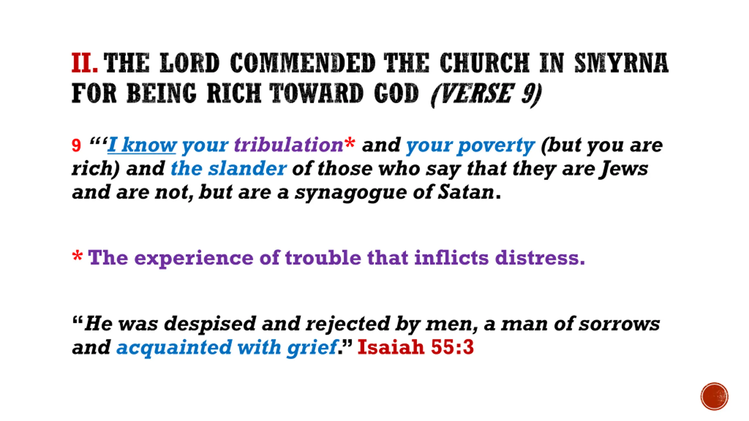 II. THE LORD COMMENDED THE CHURCH IN SMYRNA FOR BEING RICH TOWARD GOD (VERSE 9) 9 I know your tribulation* and your poverty (but you are rich) and the slander of those who say that they are Jews and are not, but are a synagogue of Satan. * The experience of trouble that inflicts distress. He was despised and rejected by men, a man of sorrows and acquainted with grief. Isaiah 55:3