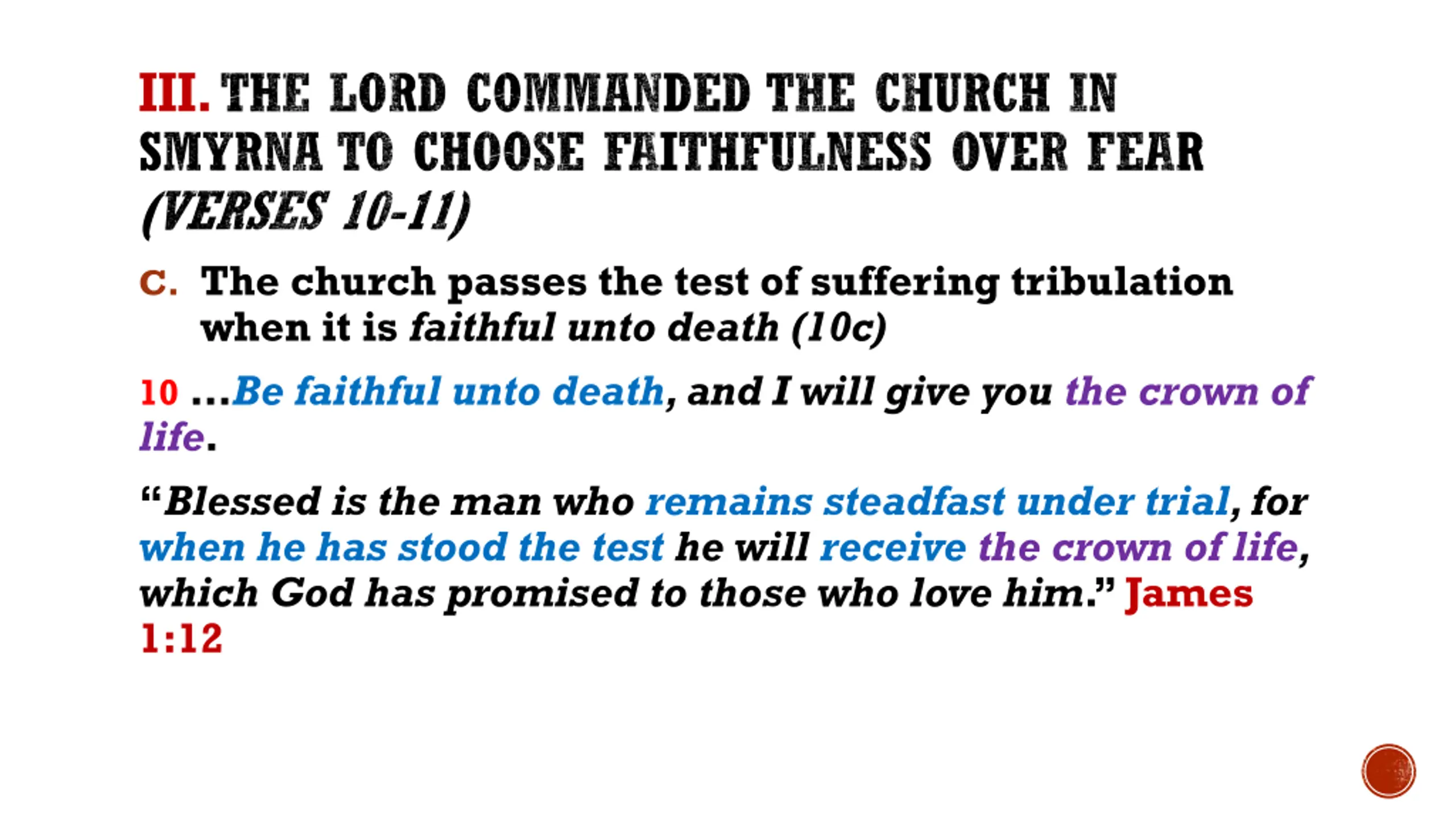 III. THE LORD COMMANDED THE CHURCH IN SMYRNA TO CHOOSE FAITHFULNESS OVER FEAR (VERSES 10-11) C. The church passes the test of suffering tribulation when it is faithful unto death(10c) 10 Be faithful unto death, and I will give you the crown of life. Blessed is the man who remains steadfast under trial, for when he has stood the test he will receive the crown of life, which God has promised to those who love him. James 1:12