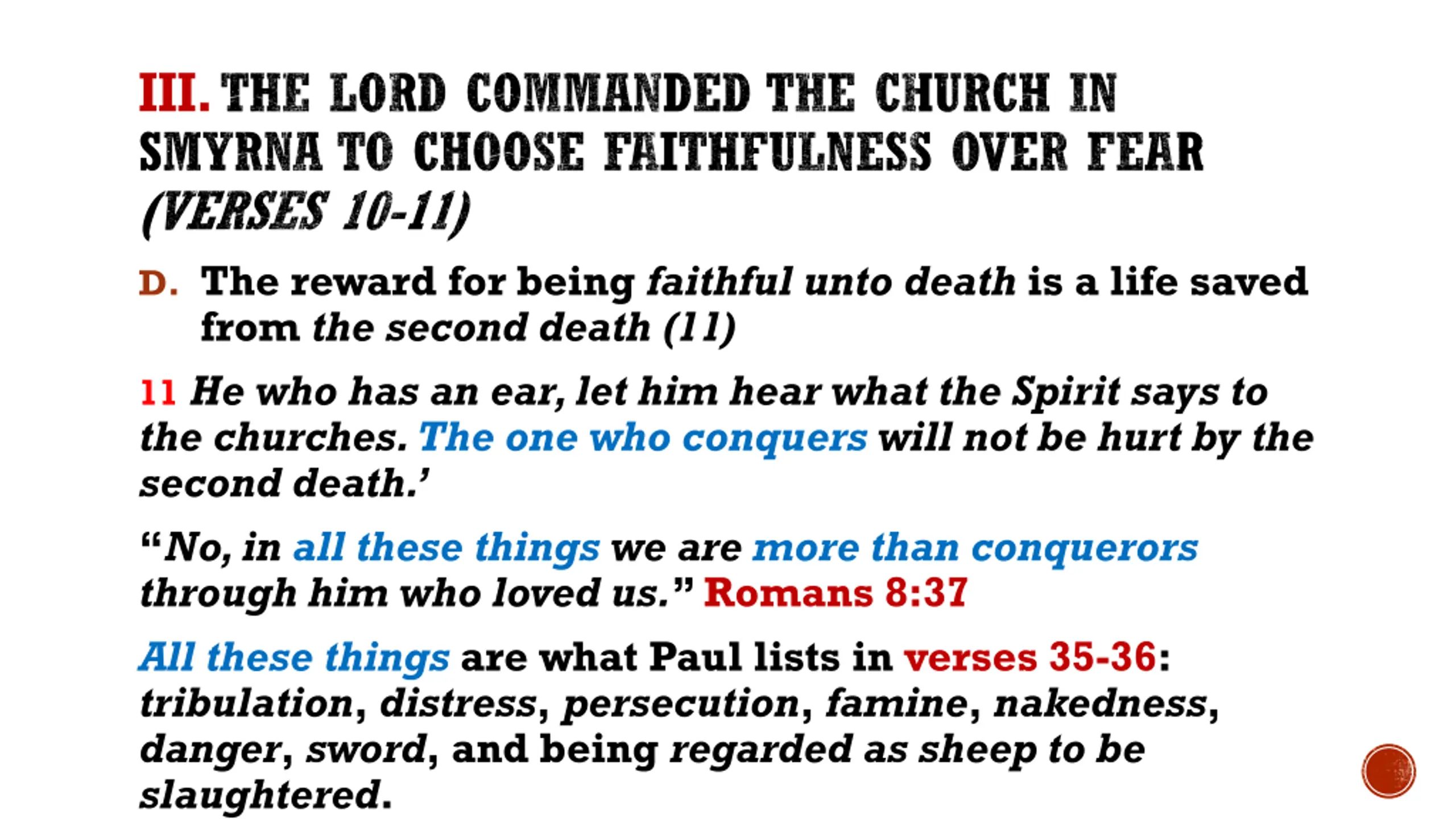 III. THE LORD COMMANDED THE CHURCH IN SMYRNA TO CHOOSE FAITHFULNESS OVER FEAR (VERSES 10-11) D. The reward for being faithful unto death is a life saved from the second death(11) 11He who has an ear, let him hear what the Spirit says to the churches. The one who conquers will not be hurt by the second death. No, in all these things we are more than conquerors through him who loved us. Romans 8:37 All these things are what Paul lists in verses 35-36: tribulation, distress, persecution, famine, nakedness, danger, sword, and being regarded as sheep to be slaughtered.