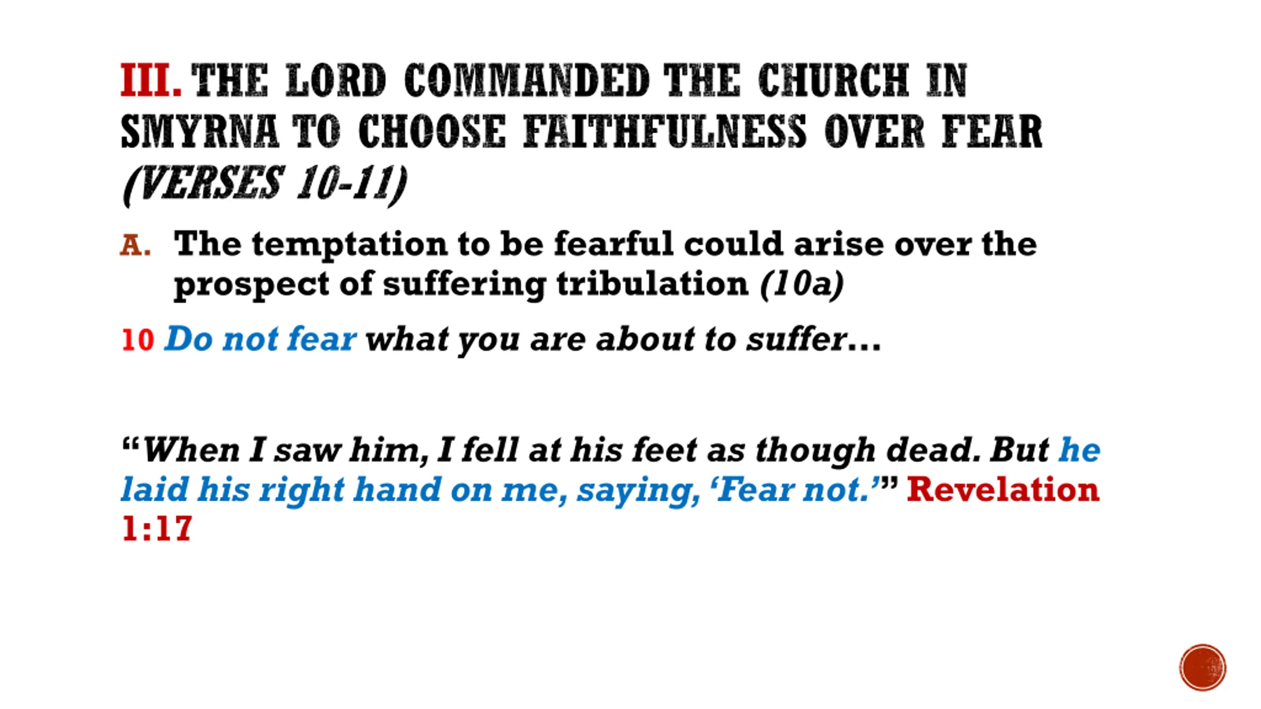III. THE LORD COMMANDED THE CHURCH IN SMYRNA TO CHOOSE FAITHFULNESS OVER FEAR (VERSES 10-11) A. The temptation to be fearful could arise over the prospect of suffering tribulation (10a) 10 Do not fear what you are about to suffer When I saw him, I fell at his feet as though dead. But he laid his right hand on me, saying, Fear not. Revelation 1:17