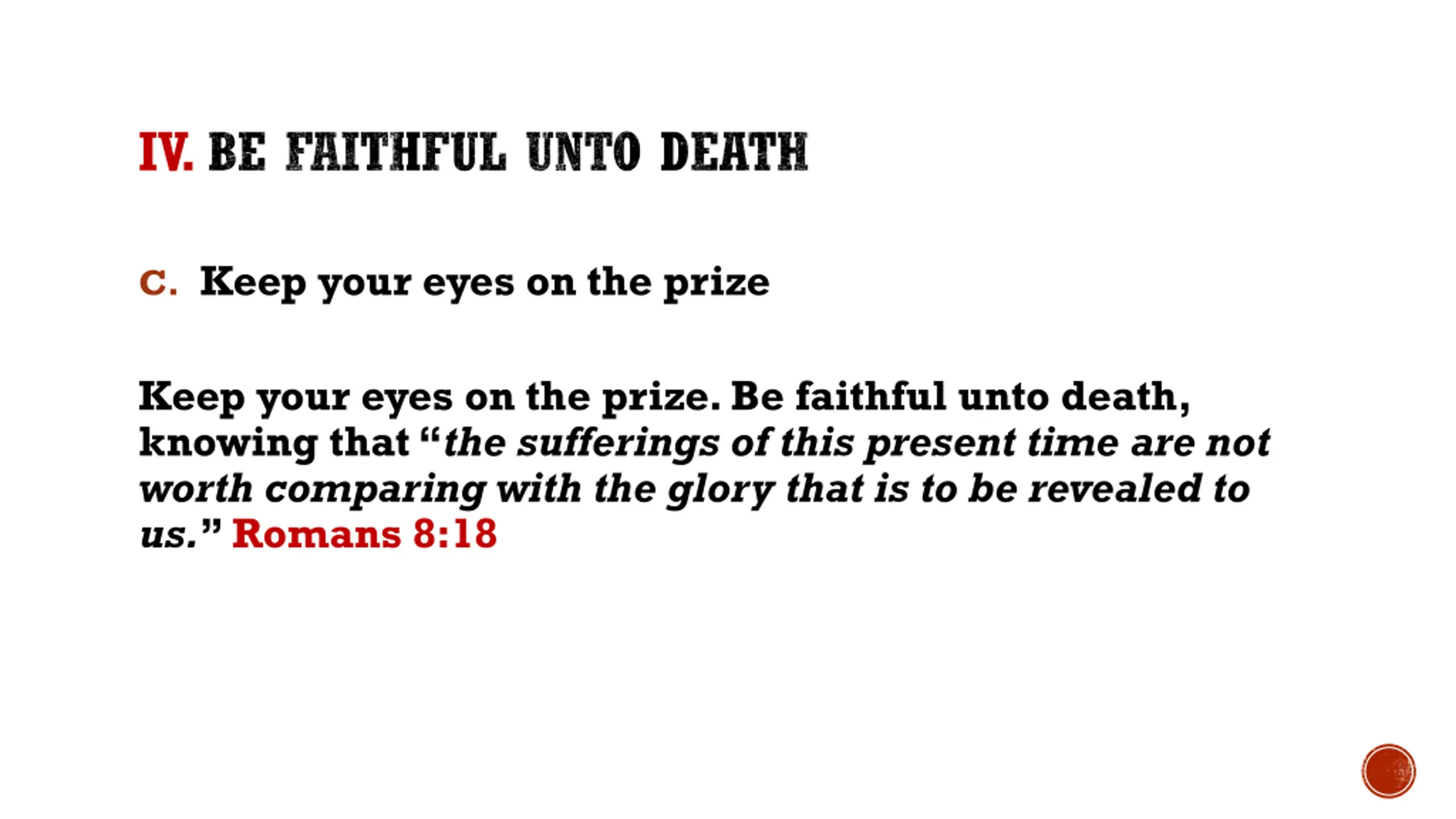 IV. BE FAITHFUL UNTO DEATH C. Keep your eyes on the prize Keep your eyes on the prize. Be faithful unto death, knowing that the sufferings of this present time are not worth comparing with the glory that is to be revealed to us. Romans 8:18
