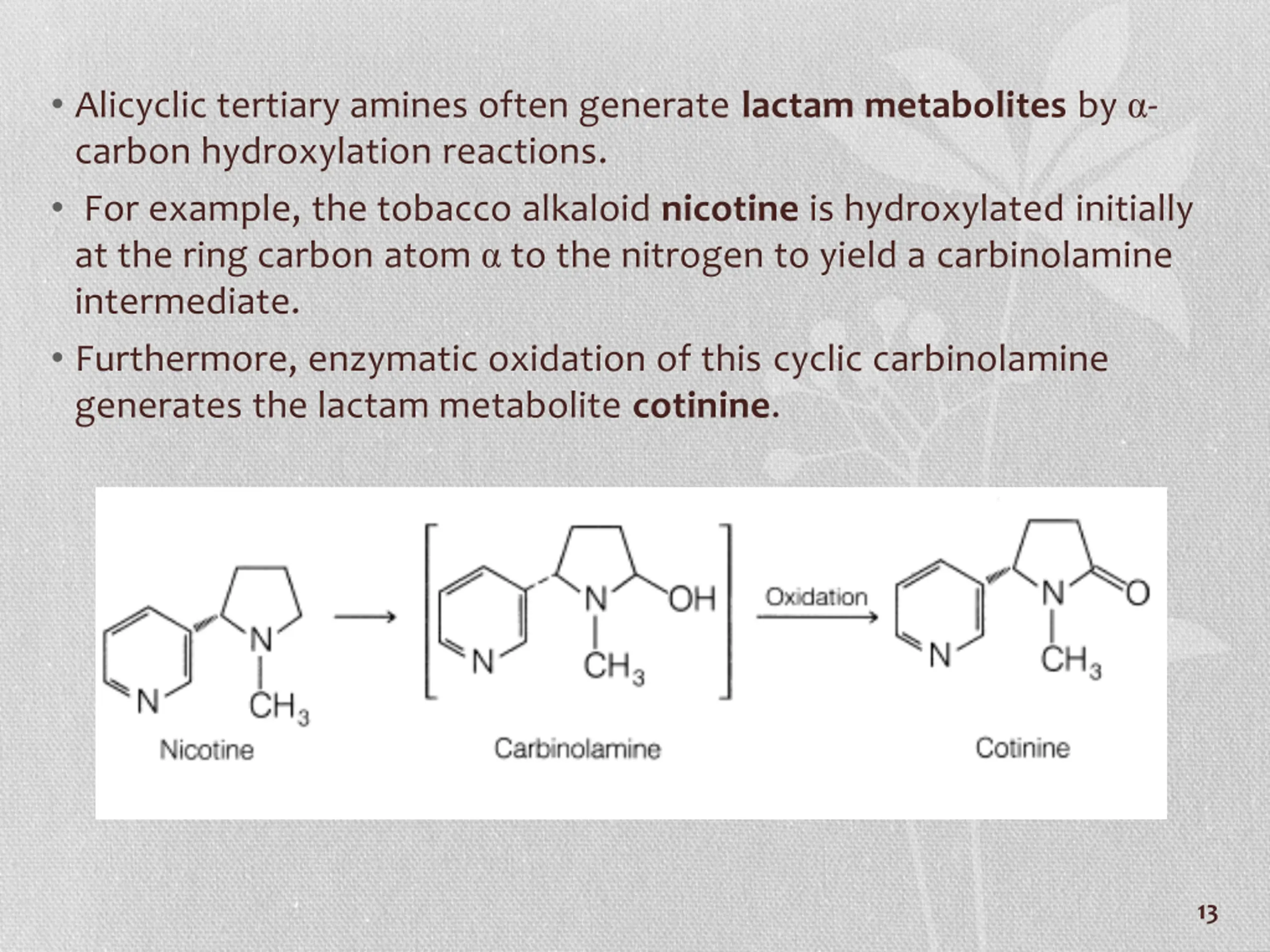 Alicyclic tertiary amines often generate lactam metabolites by - carbon hydroxylation reactions. For example, the tobacco alkaloid nicotine is hydroxylated initially at the ring carbon atom to the nitrogen to yield a carbinolamine intermediate. Furthermore, enzymatic oxidation of this cyclic carbinolamine generates the lactam metabolite cotinine. 13