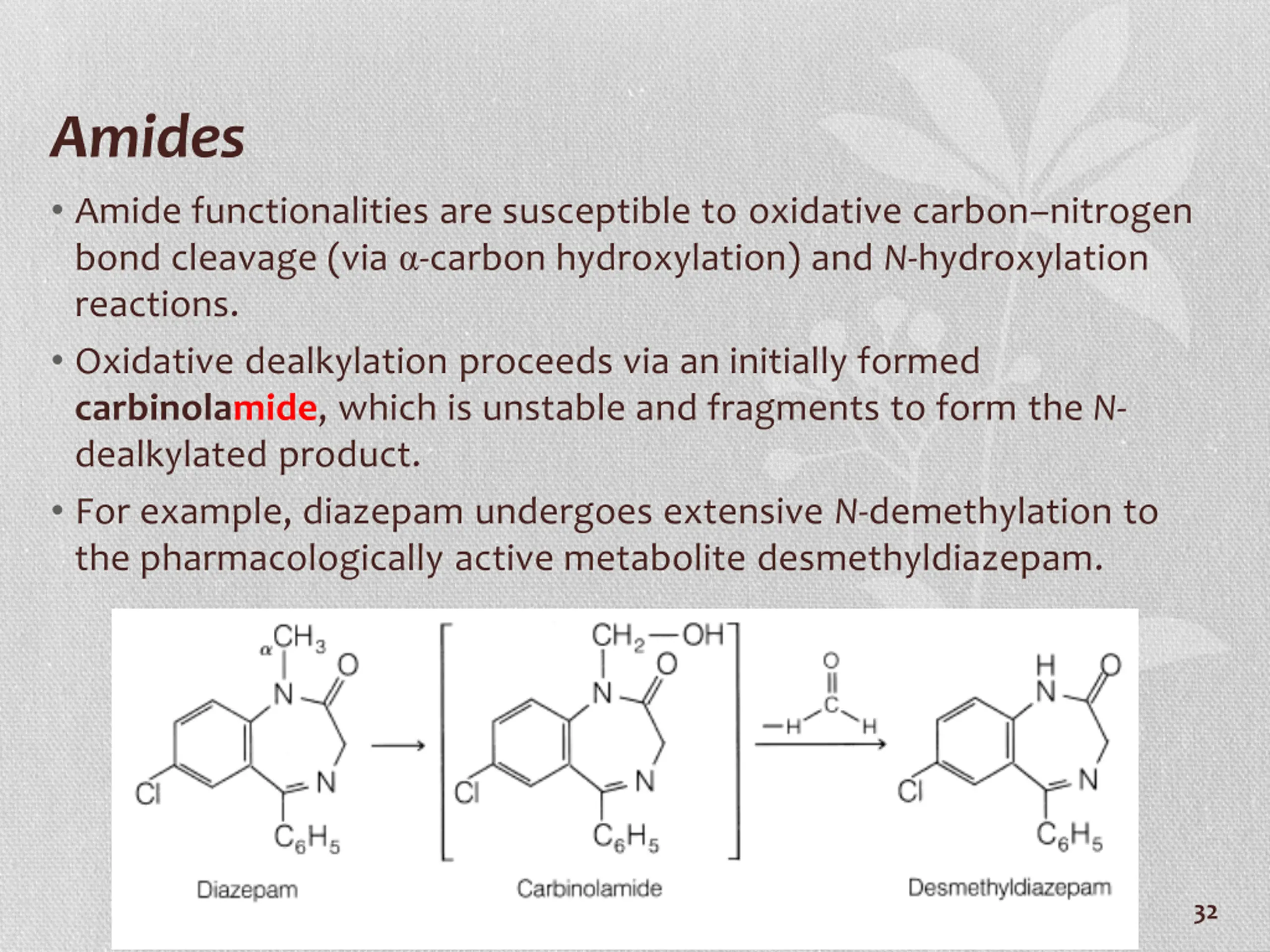 Amides Amide functionalities are susceptible to oxidative carbon nitrogen bond cleavage (via -carbon hydroxylation) and N-hydroxylation reactions. Oxidative dealkylation proceeds via an initially formed carbinolamide, which is unstable and fragments to form the N- dealkylated product. For example, diazepam undergoes extensive N-demethylation to the pharmacologically active metabolite desmethyldiazepam. 32
