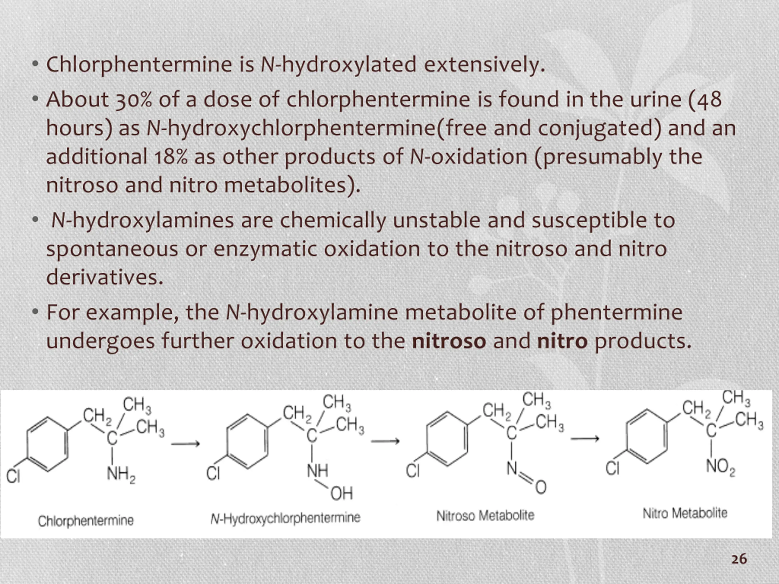 Chlorphentermine is N-hydroxylated extensively. About 30% of a dose of chlorphentermine is found in the urine (48 hours) as N-hydroxychlorphentermine(free and conjugated) and an additional 18% as other products of N-oxidation (presumably the nitroso and nitro metabolites). N-hydroxylamines are chemically unstable and susceptible to spontaneous or enzymatic oxidation to the nitroso and nitro derivatives. For example, the N-hydroxylamine metabolite of phentermine undergoes further oxidation to the nitroso and nitro products. 26