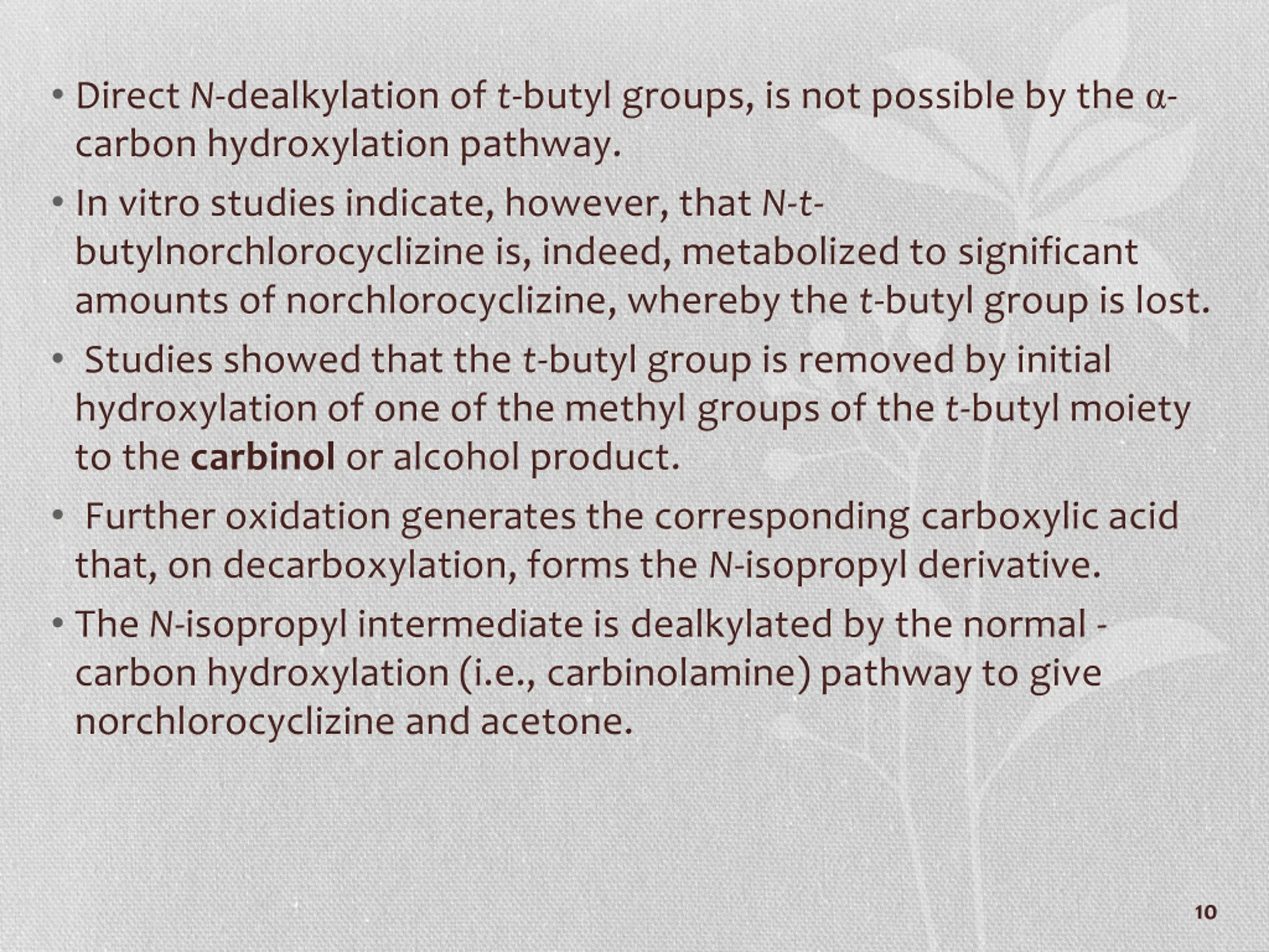 Direct N-dealkylation of t-butyl groups, is not possible by the - carbon hydroxylation pathway. In vitro studies indicate, however, that N-t- butylnorchlorocyclizine is, indeed, metabolized to significant amounts of norchlorocyclizine, whereby the t-butyl group is lost. Studies showed that the t-butyl group is removed by initial hydroxylation of one of the methyl groups of the t-butyl moiety to the carbinol or alcohol product. Further oxidation generates the corresponding carboxylic acid that, on decarboxylation, forms the N-isopropyl derivative. The N-isopropyl intermediate is dealkylated by the normal - carbon hydroxylation (i.e., carbinolamine) pathway to give norchlorocyclizine and acetone. 10